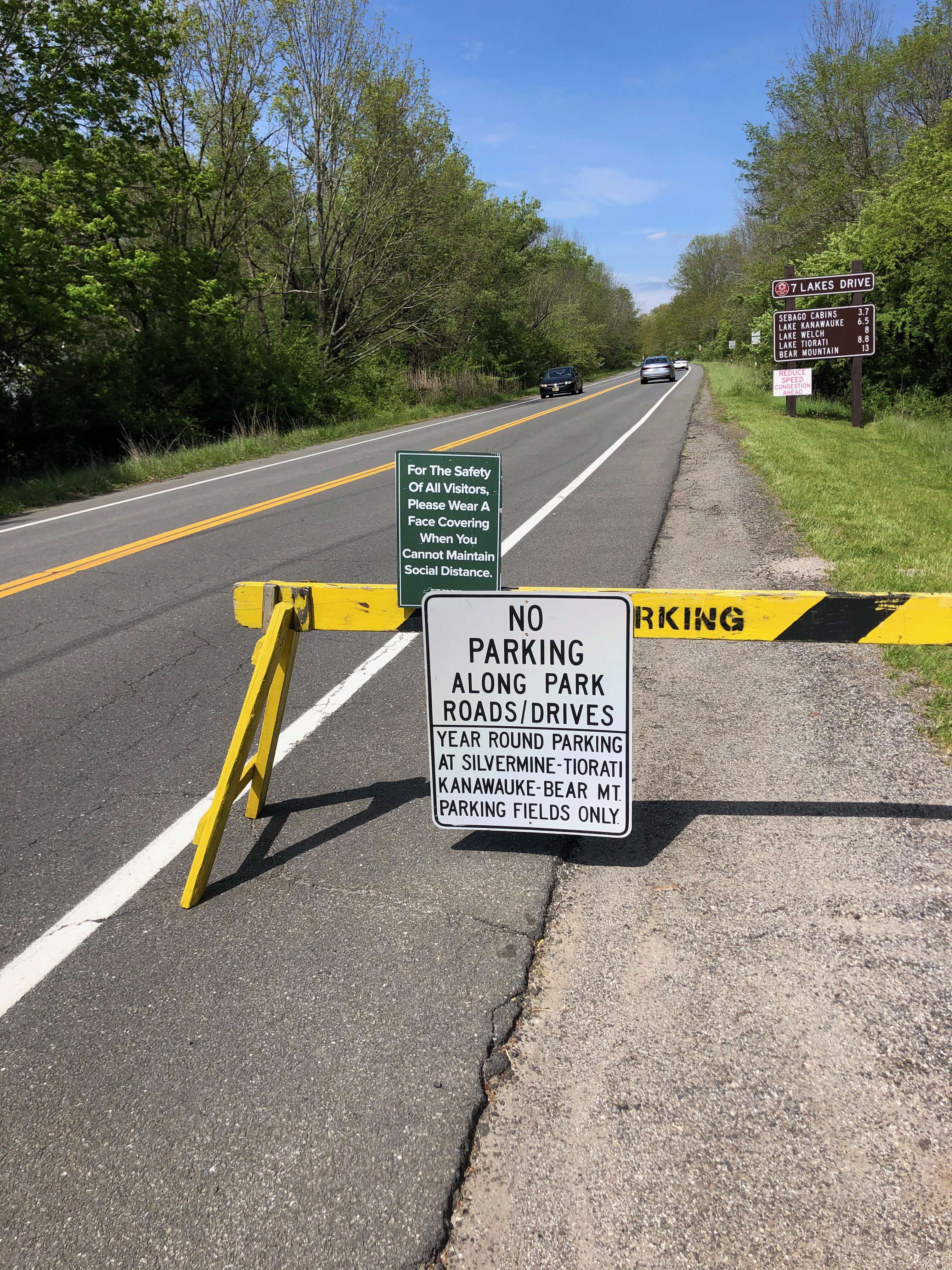 At the entrance of Harriman State Park a road block is set up with signs informing people of the safety precautions that must be taken (social distancing and the wearing of masks) and the parking guidelines that are to be followed.