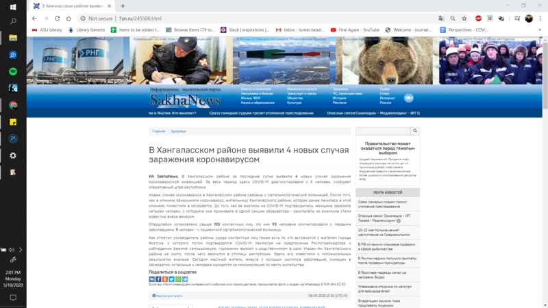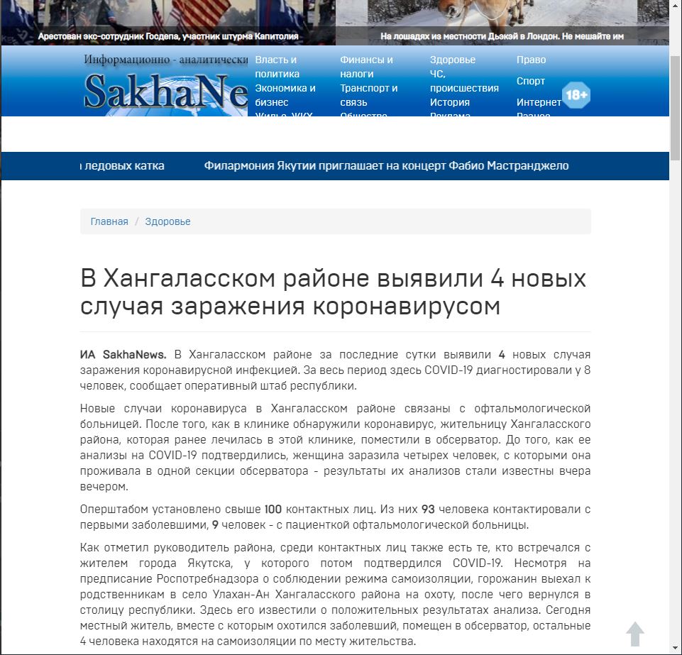 “Over the past 24 hours, 4 new cases of coronavirus infection have been detected in the Khangalassky district . Over the entire period, COVID-19 was diagnosed in 8 people, according to the operational headquarters of the republic. New cases of coronavirus in the Khangalassky district are associated with an ophthalmic hospital. After the coronavirus was discovered in the clinic, a resident of the Khangalassky district, who had previously been treated in this clinic, was placed in the observatory….The headquarters has established over 100 contacts. Of these, 93 people were in contact with the first cases, 9 people - with a patient in an ophthalmological hospital….As the head of the district noted, among the contact persons there are also those who met with a resident of the city of Yakutsk, who later confirmed COVID-19. Despite the order of Rospotrebnadzor to observe the regime of self-isolation, the townspeople went to his relatives in the village of Ulakhan-An of the Khangalassky region for hunting, after which he returned to the capital of the republic. Here he was informed of the positive results of the analysis. Today, the local resident, with whom the sick man was hunting, is placed in the observatory, the remaining 4 people are on self-isolation at the place of residence.” #IndigenousStories