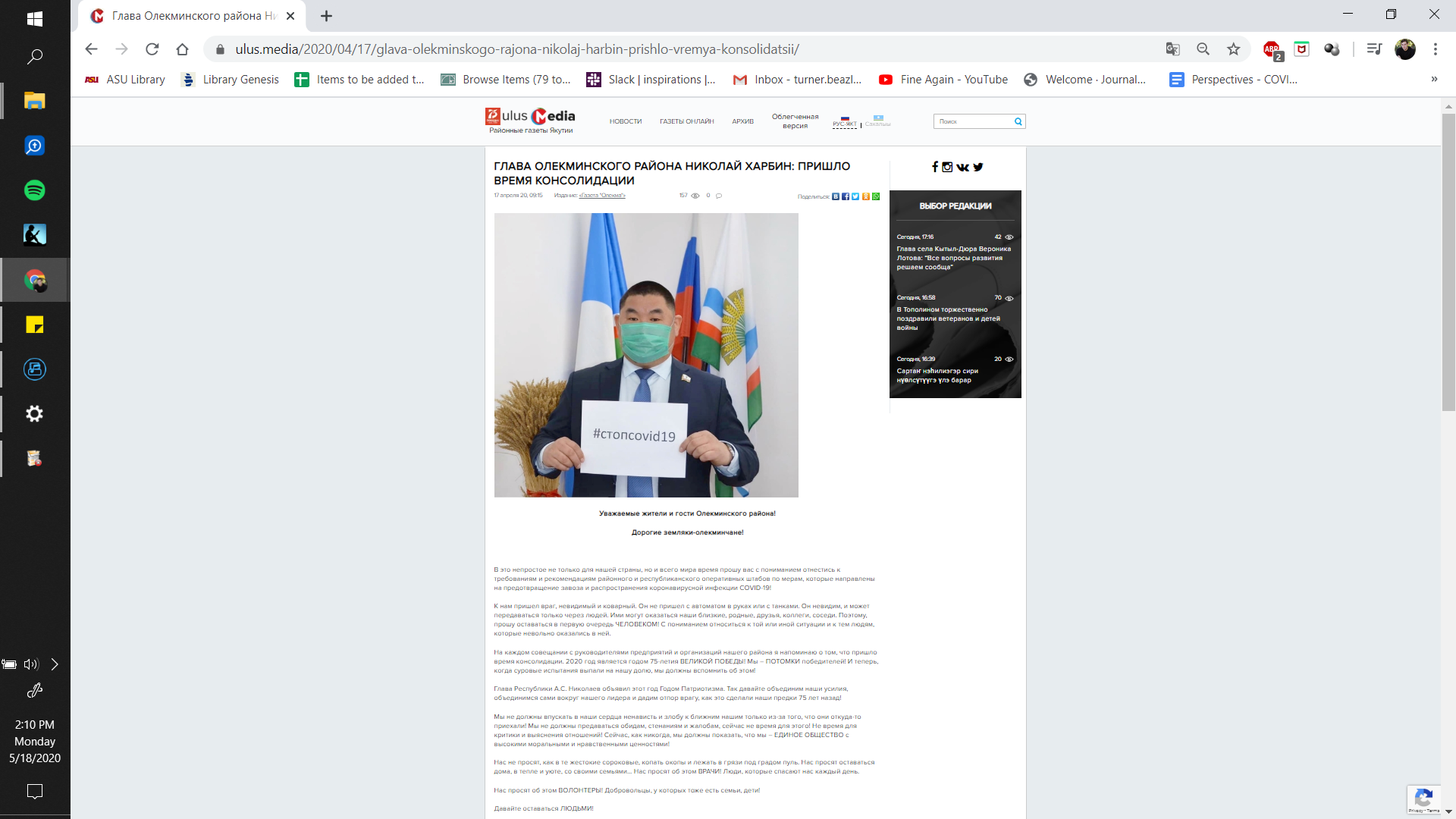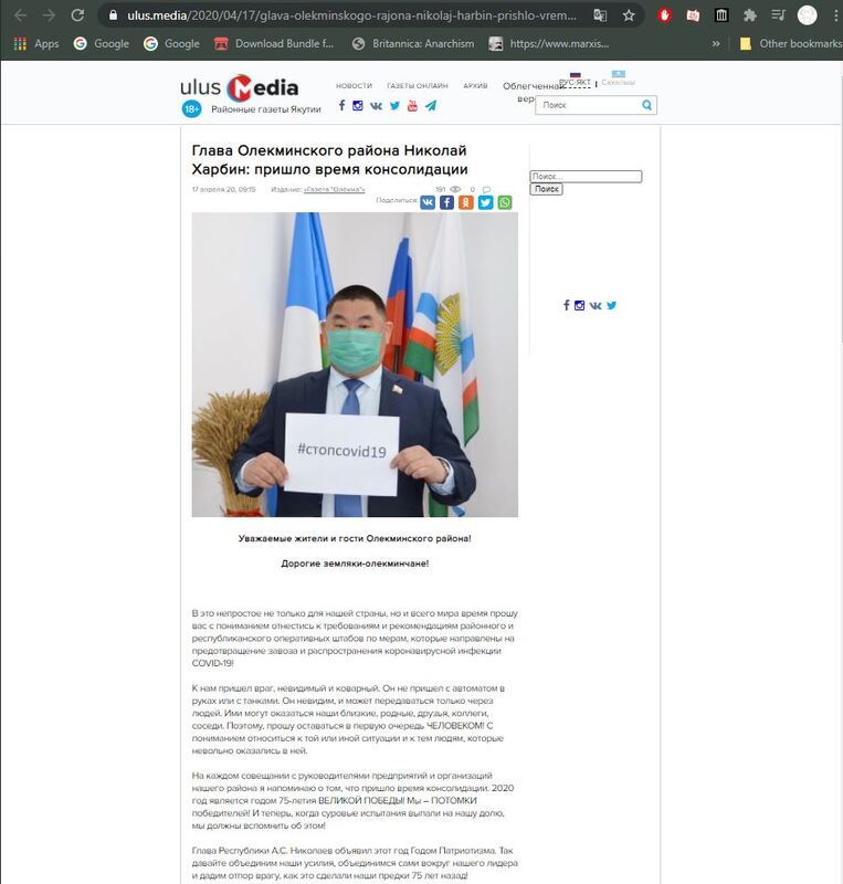 “At this difficult time, not only for our country, but for the whole world, I ask you to treat with understanding the requirements and recommendations of the district and republican operational headquarters for measures aimed at preventing the import and spread of coronavirus infection COVID-19! An enemy came to us, invisible and treacherous. He did not come with a machine gun in his hands or with tanks. It is invisible, and can only be transmitted through people. They may be our relatives, friends, colleagues, neighbors. Therefore, I ask you to remain primarily a HUMAN! With understanding to treat this or that situation and to those people who involuntarily appeared in it… Head of the Republic A.S. Nikolaev declared this year the Year of Patriotism. So let's unite our efforts, unite ourselves around our leader and repulse the enemy, as our ancestors did 75 years ago!” #IndigenousStories