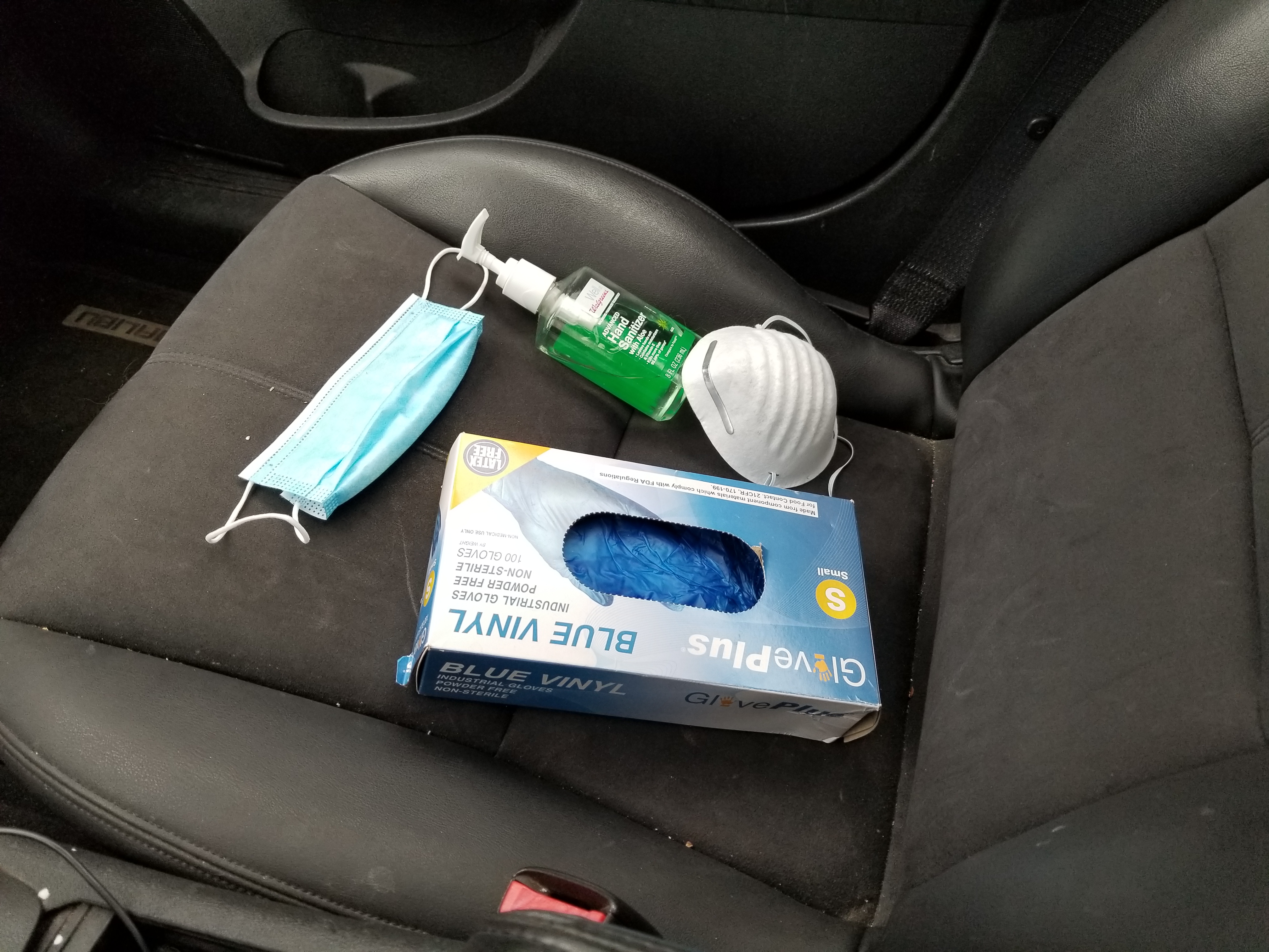A photo showing the protective equipment that I never leave home without. Pictured is hand sanitizer, rubber gloves, and multiple face masks.
