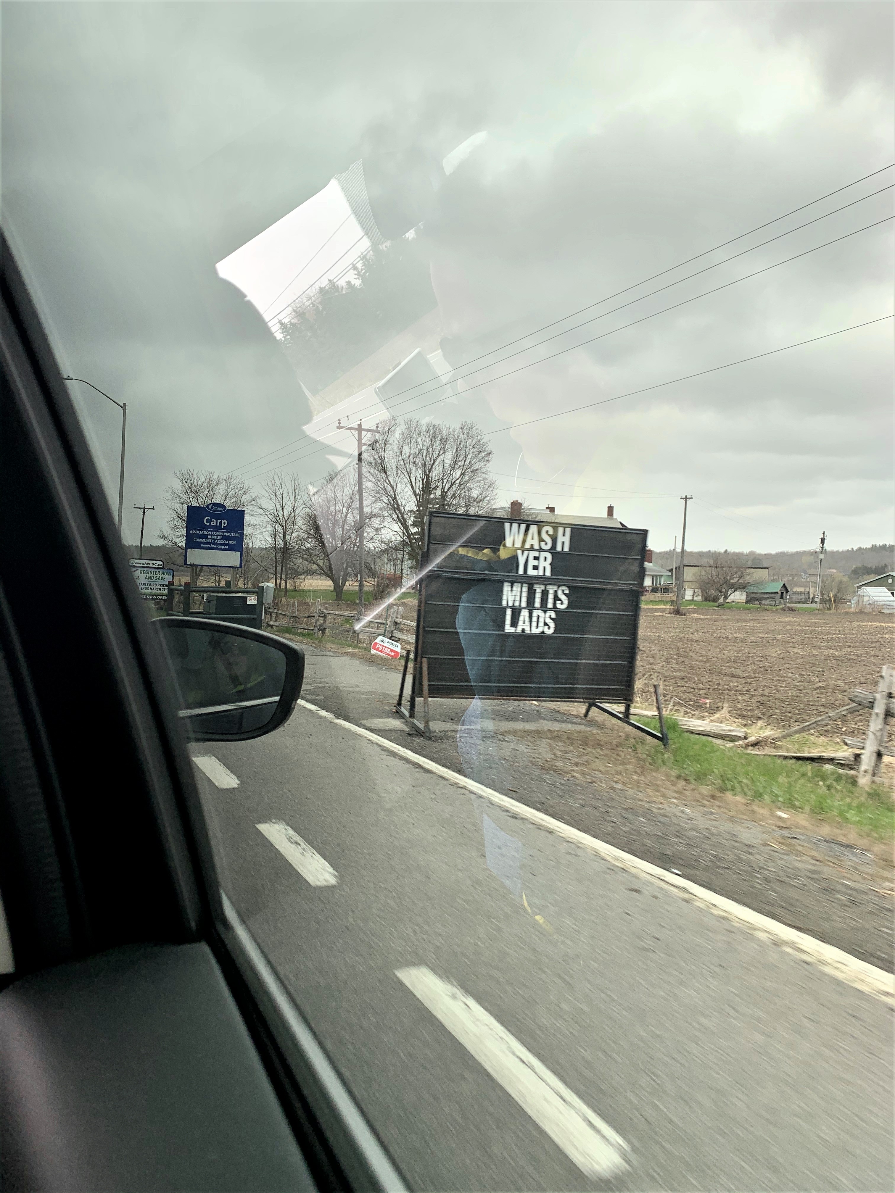 This photograph was taken while driving through the intersection of Carp Rd. and March Rd. in the National Capital Region. It shows a roadside advertising board, in front of the town sign for the village of Carp, which reads "Wash Yer Mitts Lads" referring to the medical advise to wash your hands often to prevent the spread of the covid-19 virus. While other signs exist with similar sentiments, this sign is unique in that it is not visually associated with a business or public entity. Its lack of context gives the impression that it is a message from the community to its members rather than an advertisement or a public health announcement. What is more, the phrasing and spelling of the word "yer" emulates the slang and accent of the Ottawa Valley, further connecting it to the community in which it is situated and making it more lighthearted. While still a warning or admonishment to prevent the spread of the disease, this sign also pokes fun at the current situation in a very local manner.