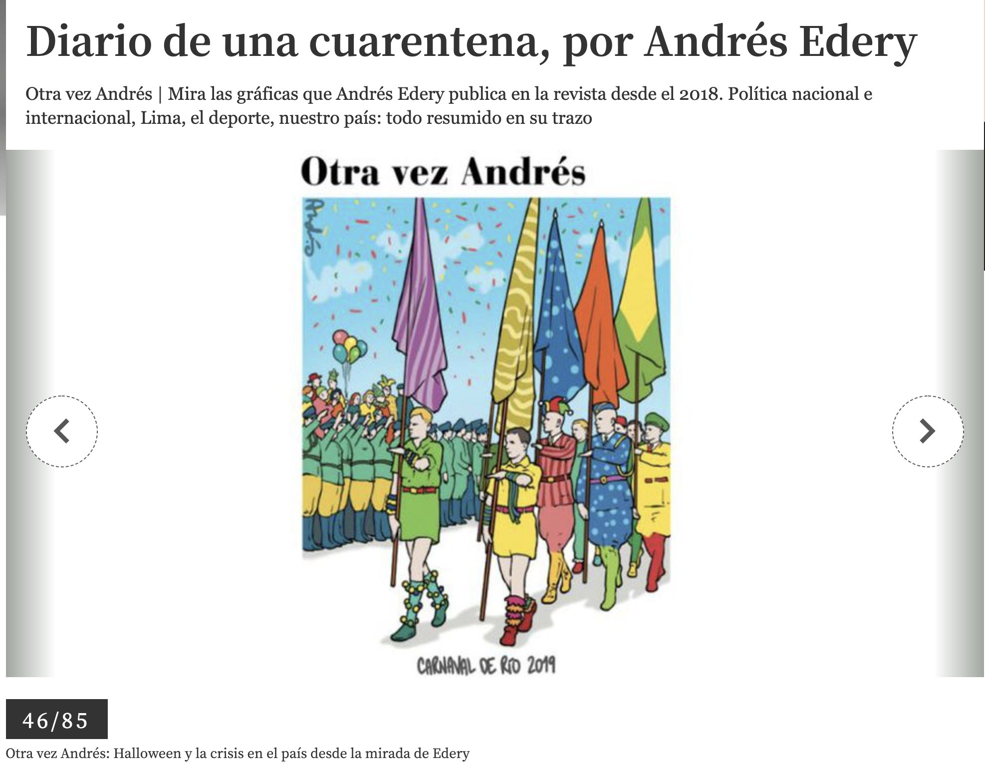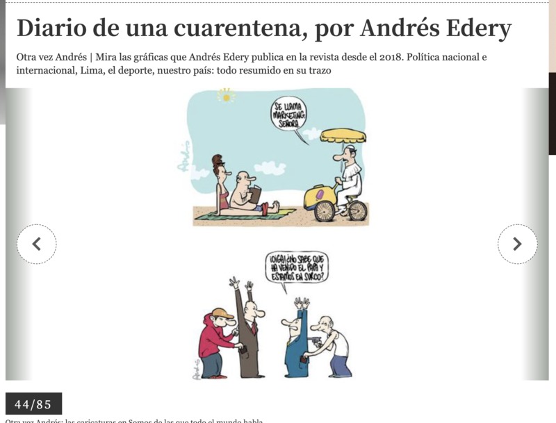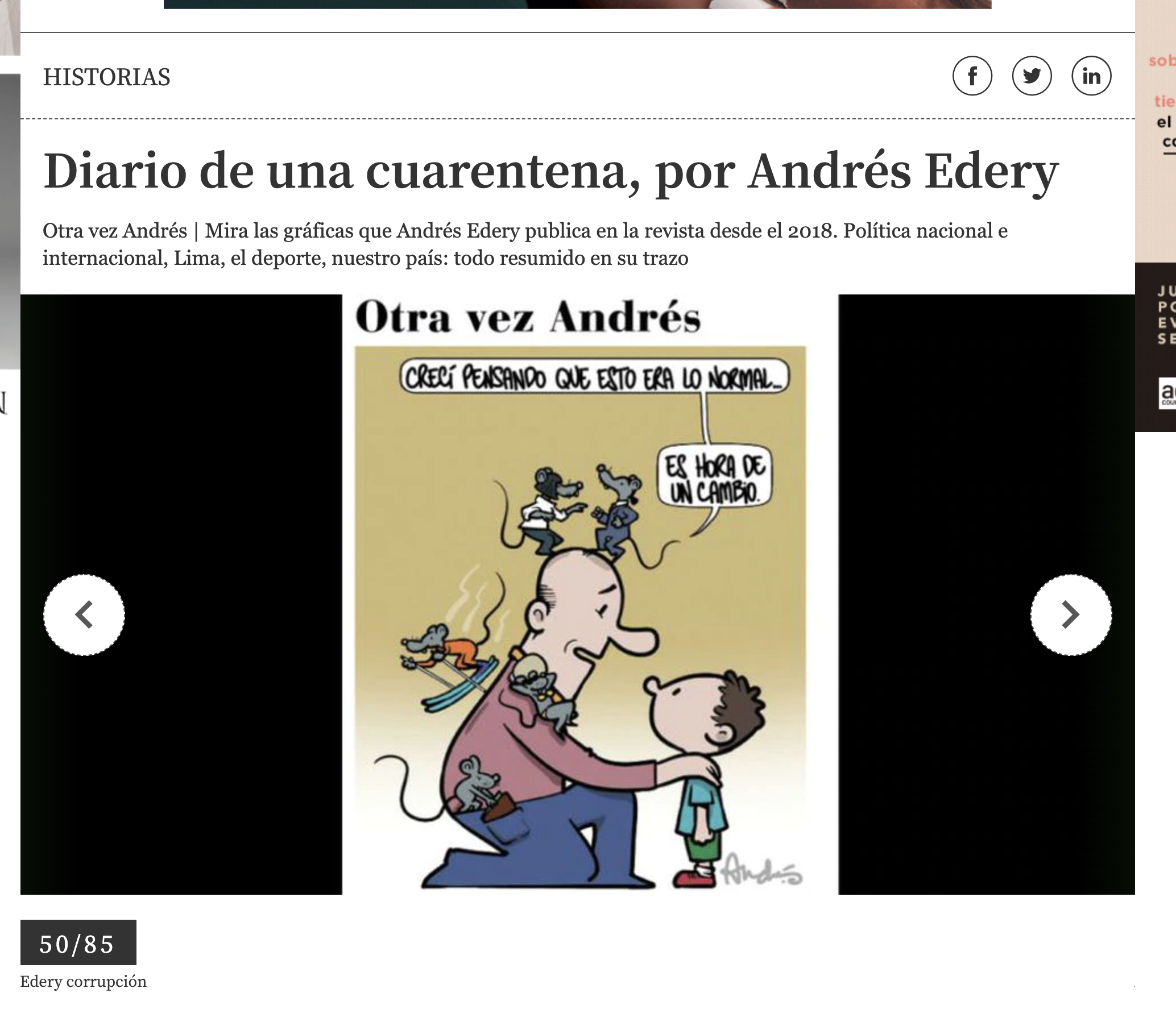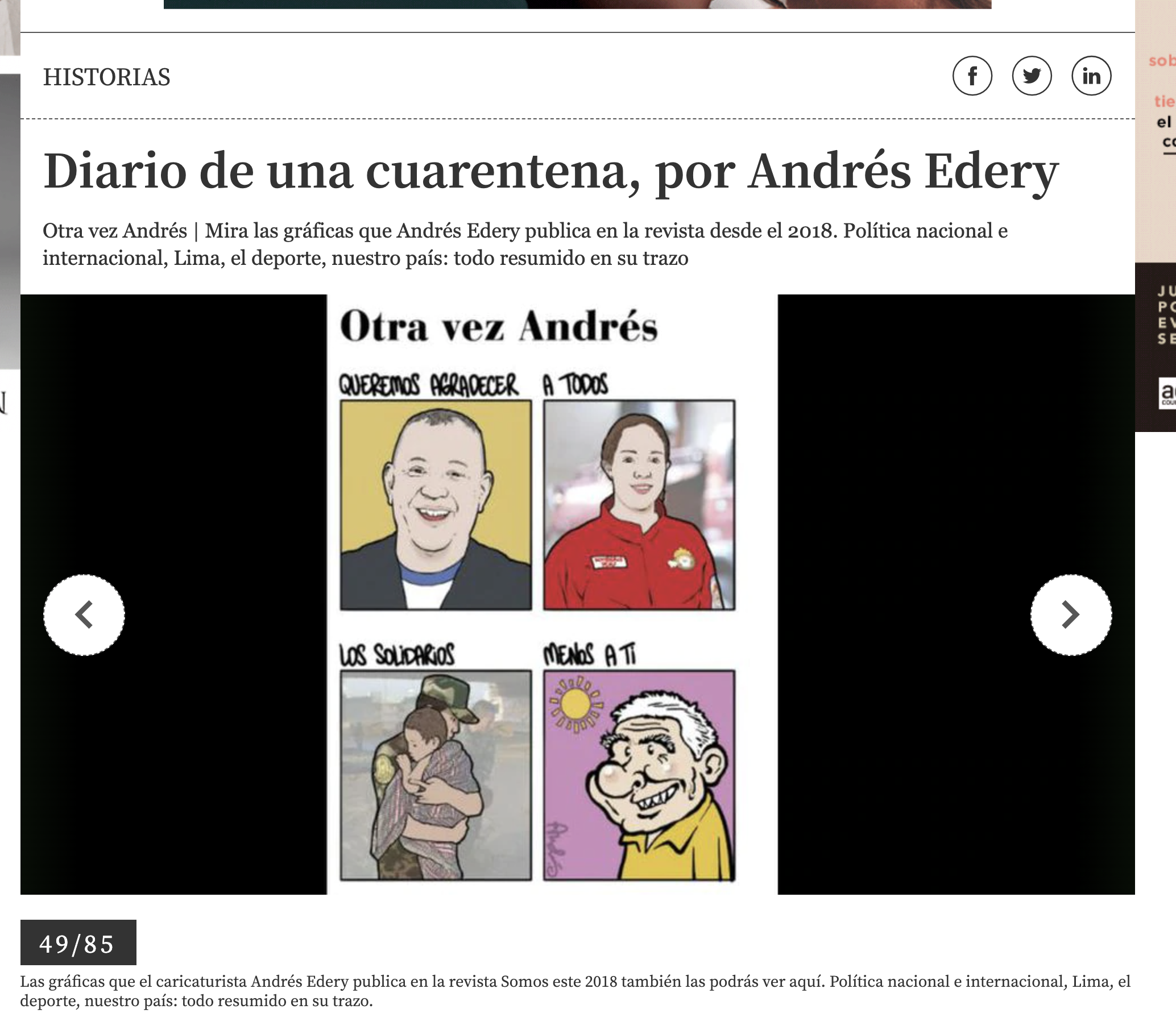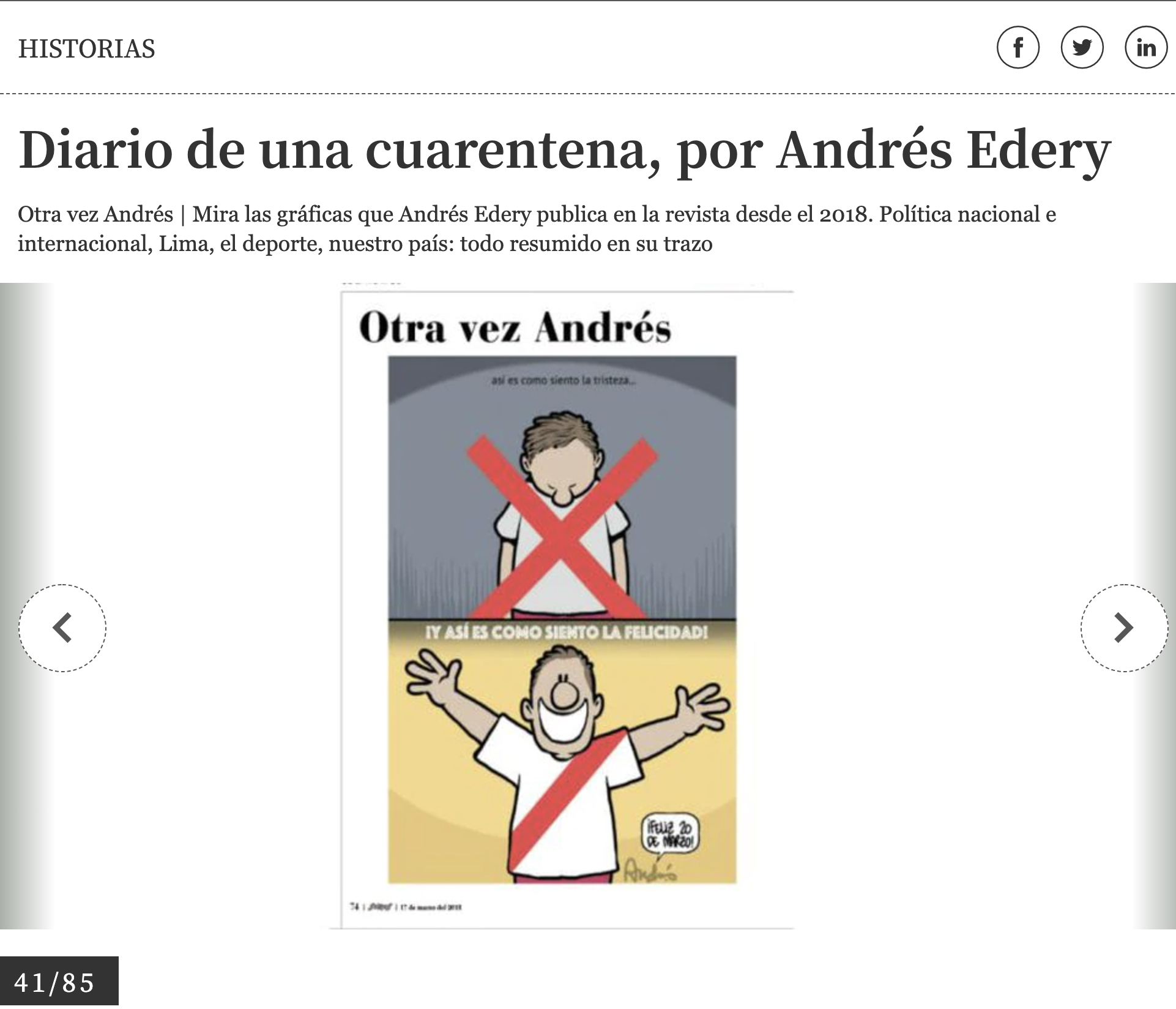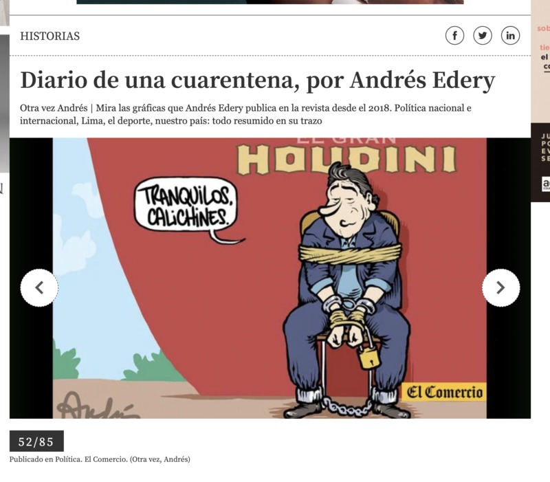 Items 41-60 in Diario de una cuarentena, por Andrés Edery, a series of political cartoons hosted by El Comercio Peru's website in the Historias section.