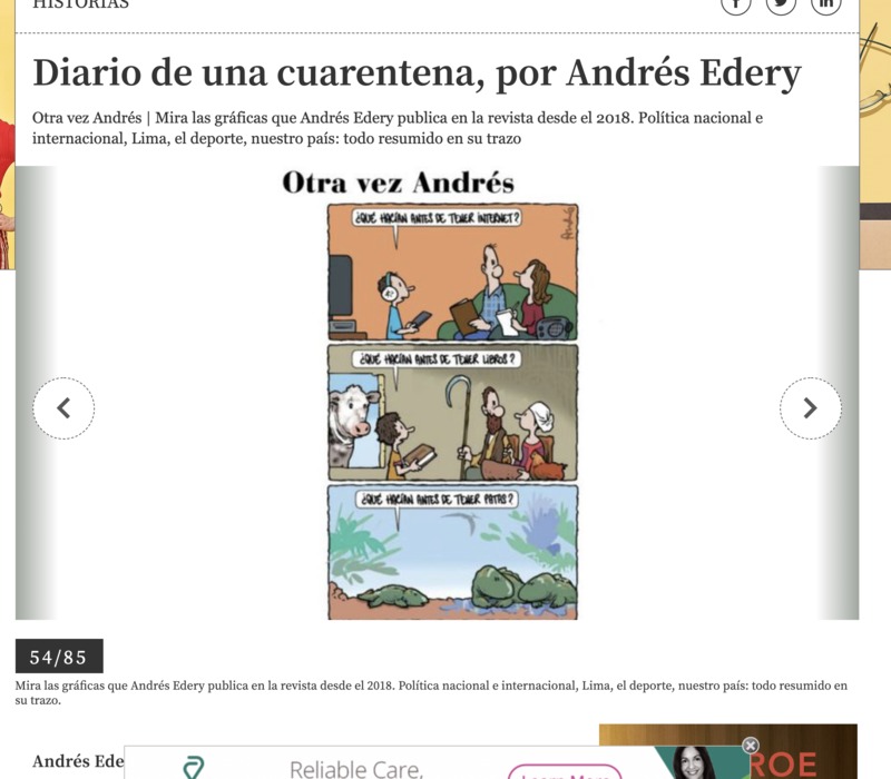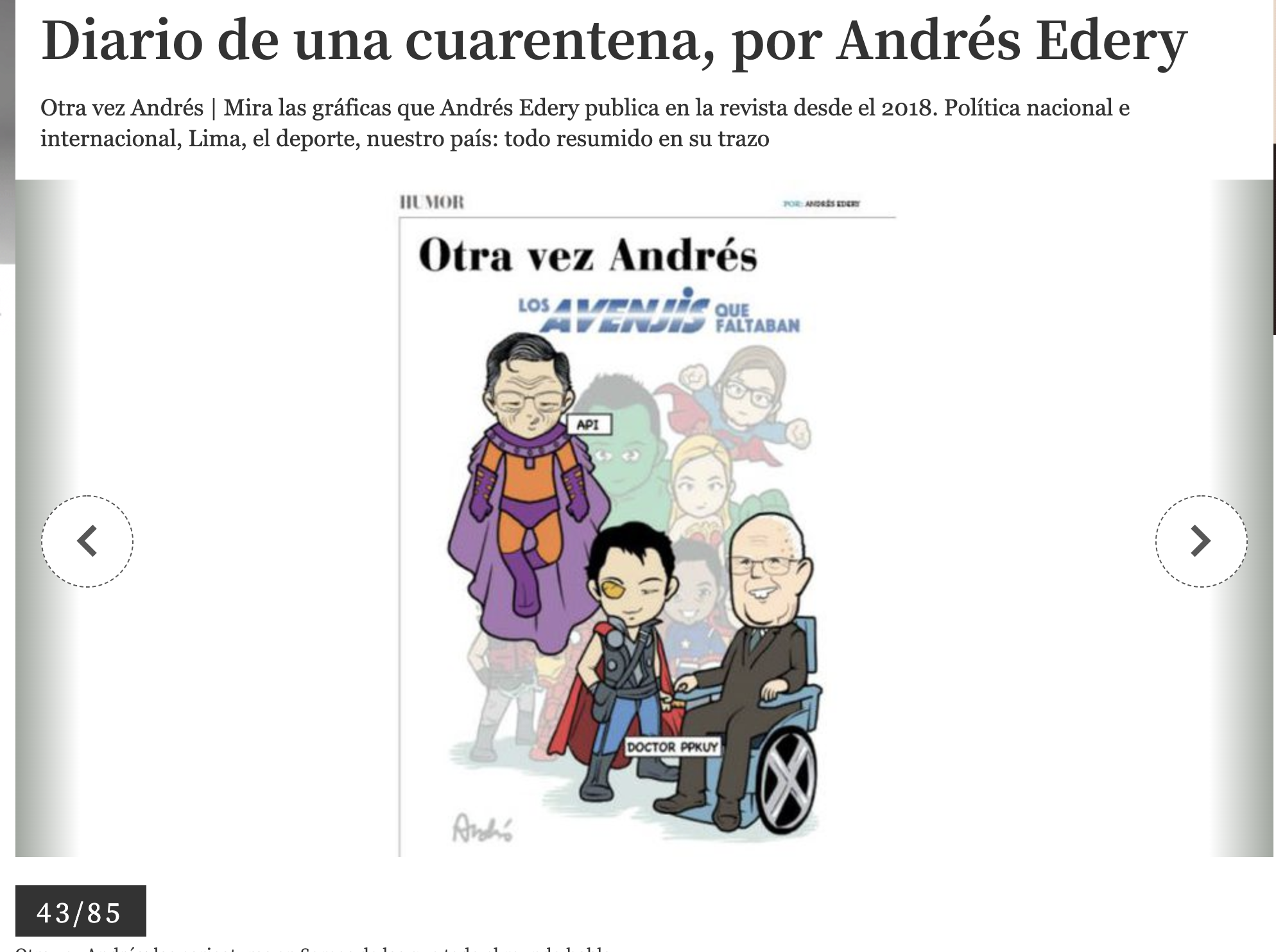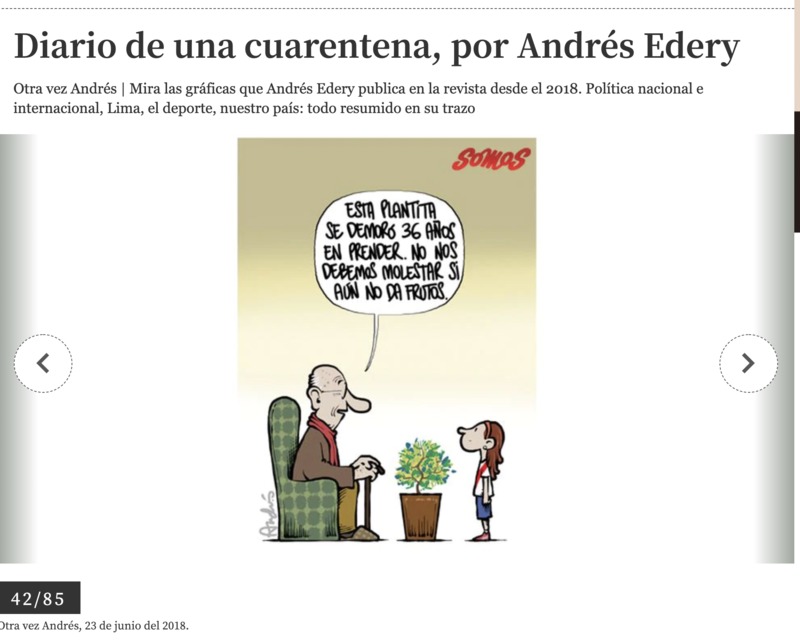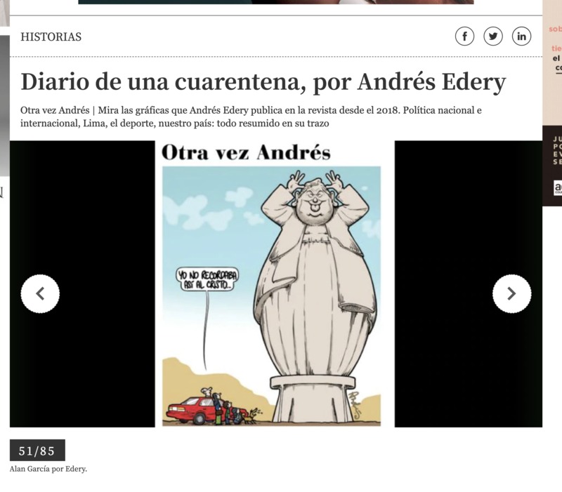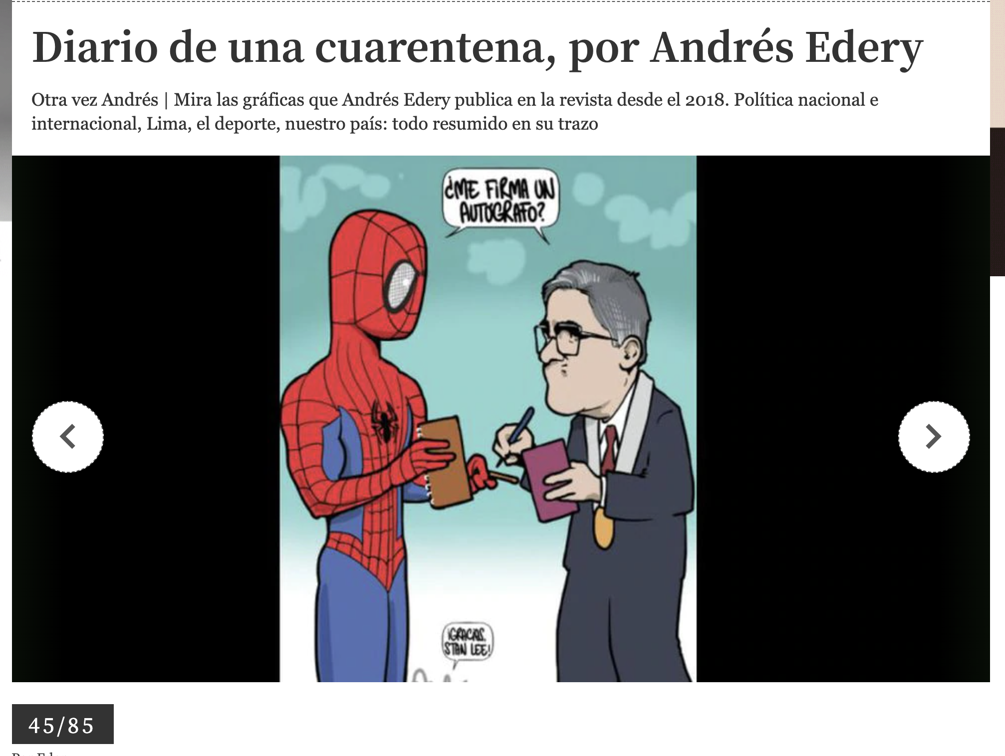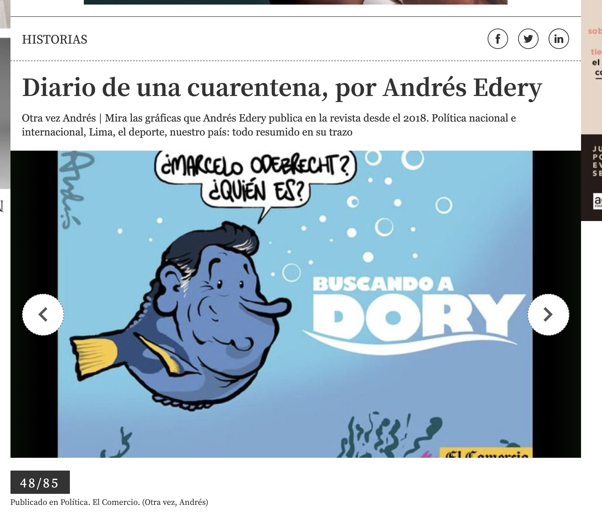 Items 41-60 in Diario de una cuarentena, por Andrés Edery, a series of political cartoons hosted by El Comercio Peru's website in the Historias section.