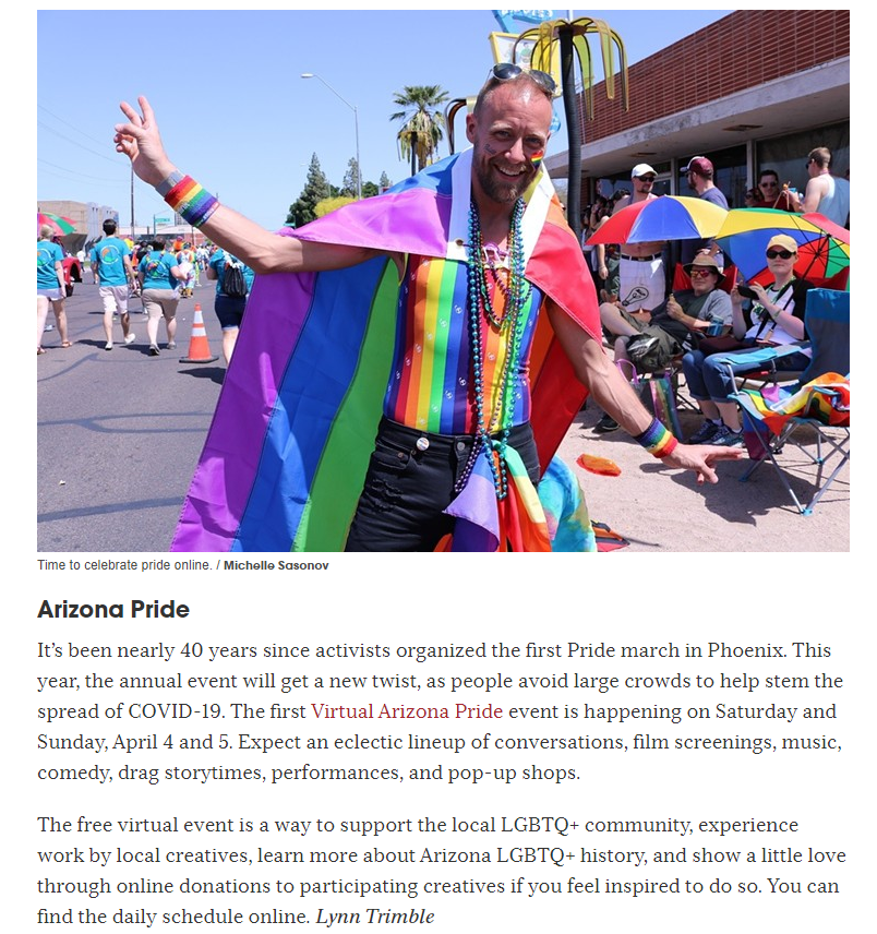 From the article: "Arizona Pride It’s been nearly 40 years since activists organized the first Pride march in Phoenix. This year, the annual event will get a new twist, as people avoid large crowds to help stem the spread of COVID-19. The first Virtual Arizona Pride event is happening on Saturday and Sunday, April 4 and 5. Expect an eclectic lineup of conversations, film screenings, music, comedy, drag storytimes, performances, and pop-up shops. The free virtual event is a way to support the local LGBTQ+ community, experience work by local creatives, learn more about Arizona LGBTQ+ history, and show a little love through online donations to participating creatives if you feel inspired to do so. You can find the daily schedule online."