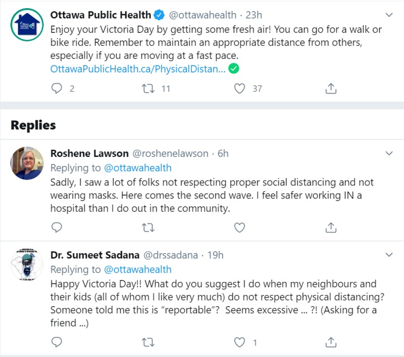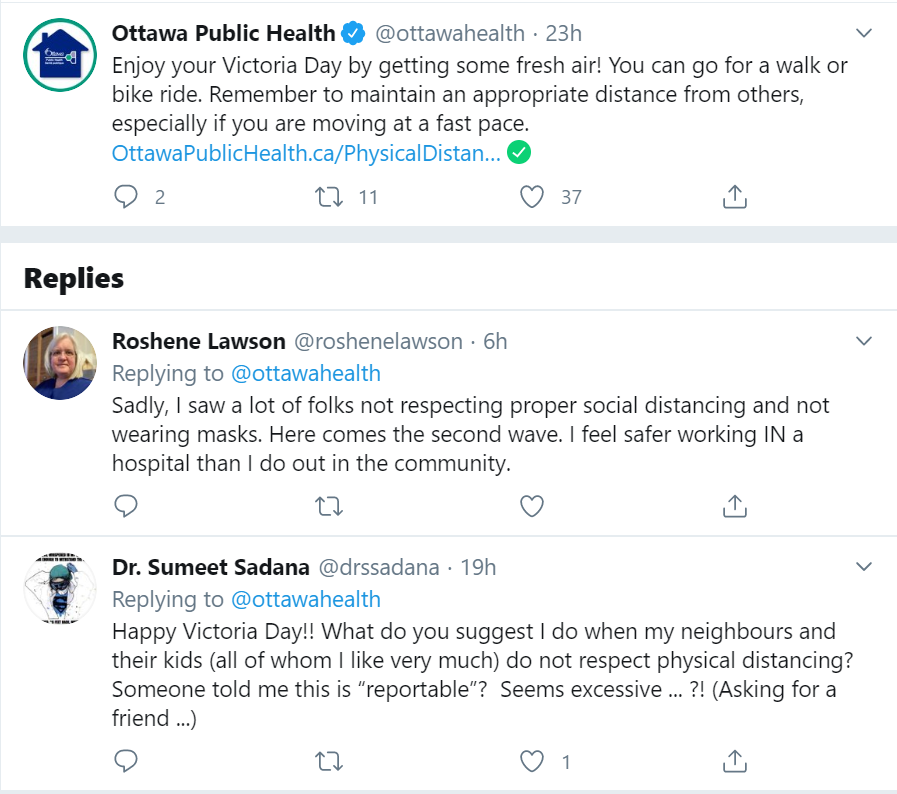 The image is a tweet from Ottawa Public Health promoting maintaining a safe distance and observing safety measures during the Victoria Day holiday which usually features outdoor activities. Additionally, it shows the responses to this message by some members of the public, expressing their frustration with others for not following guidelines
