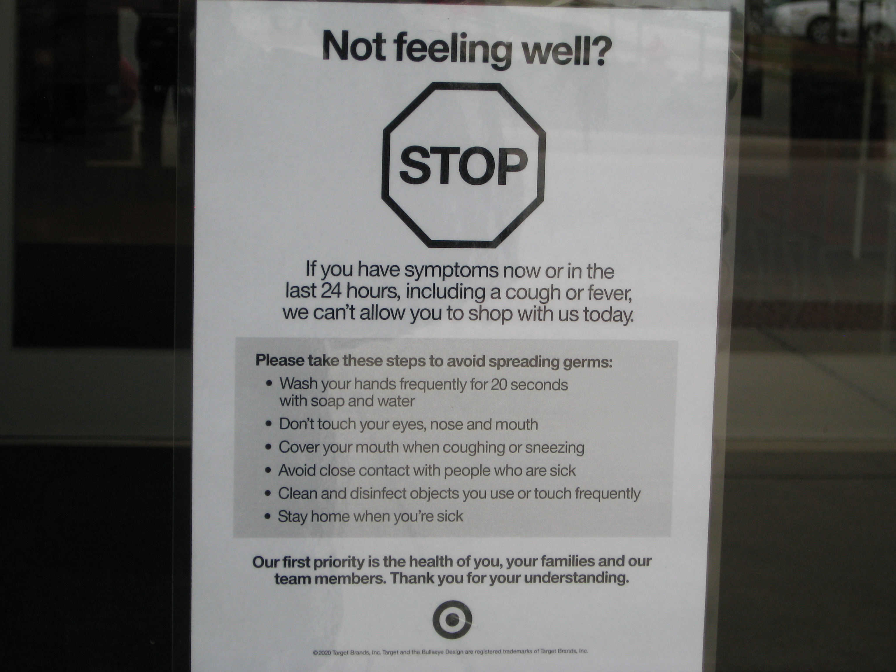 Signs, like this one at a west Wichita Target, act as a first line of defense against the coronavirus by instructing potentially-ill shoppers to turn back should they happen to have any of the listed symptoms. While a cough or a fever does not necessarily mean that a person has COVID-19, the highly contagious disease's stealthy transmission, combined with modern medicine's nascent understanding of the illness, has made such precautions a necessity as communities try to mitigate the virus's effects.