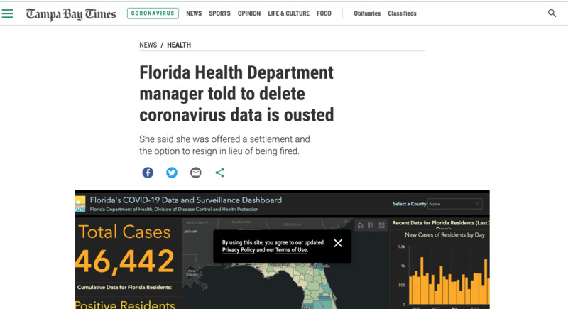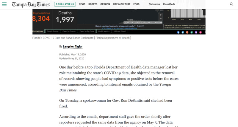 This article is about a Florida woman who created the graph for Florida Corona Virus Update, was fired due to not wanting to lie or be dishonest due to the state wanting to open up sooner, as a result she was fired.