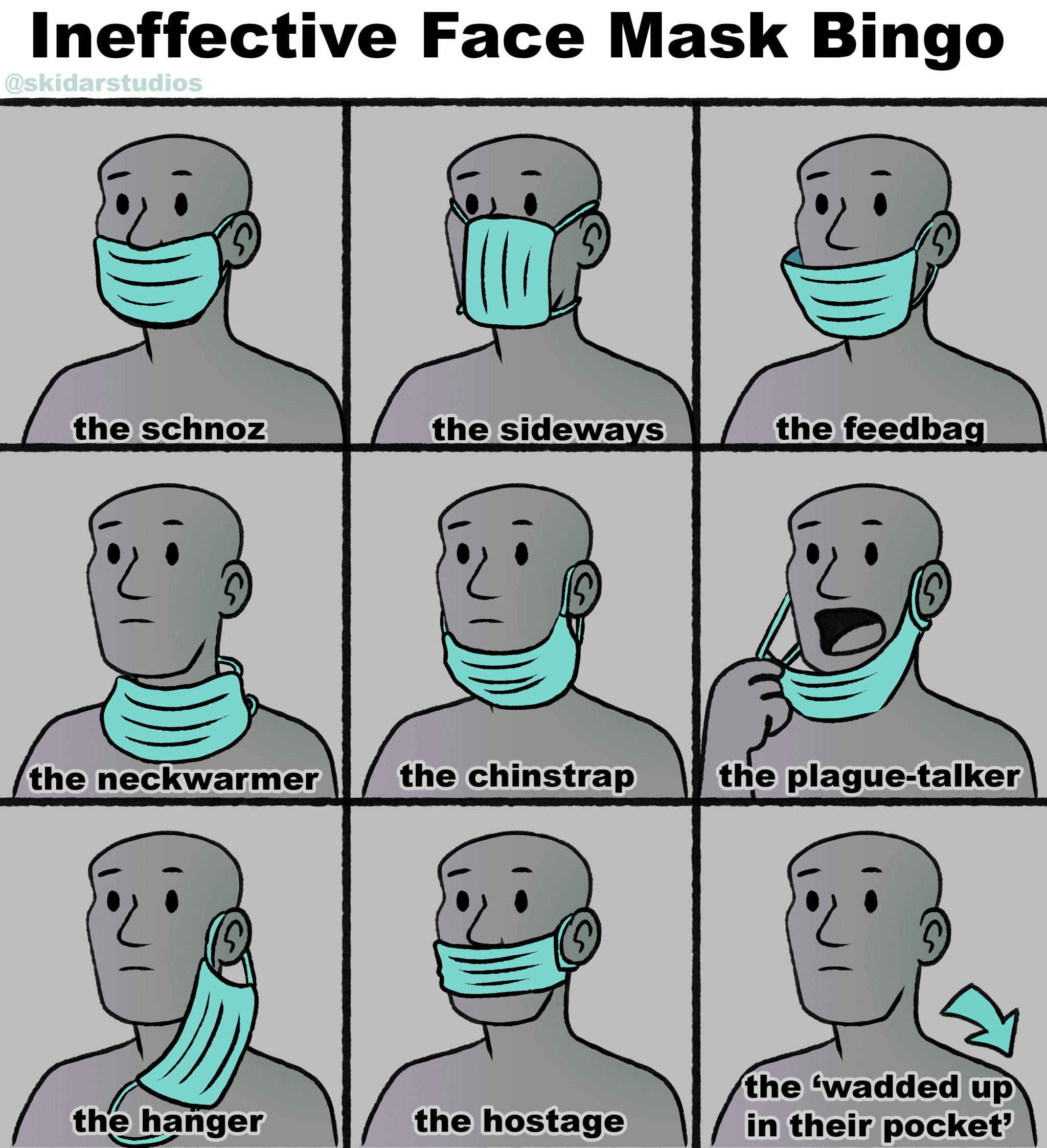 Following the popular meme/comic format of bingo cards, this comic illustrates the numerous ineffective/wrong ways people are wearing face masks in public. The original caption on instagram reads "For all my retail worker friends, what we see on a daily basis...