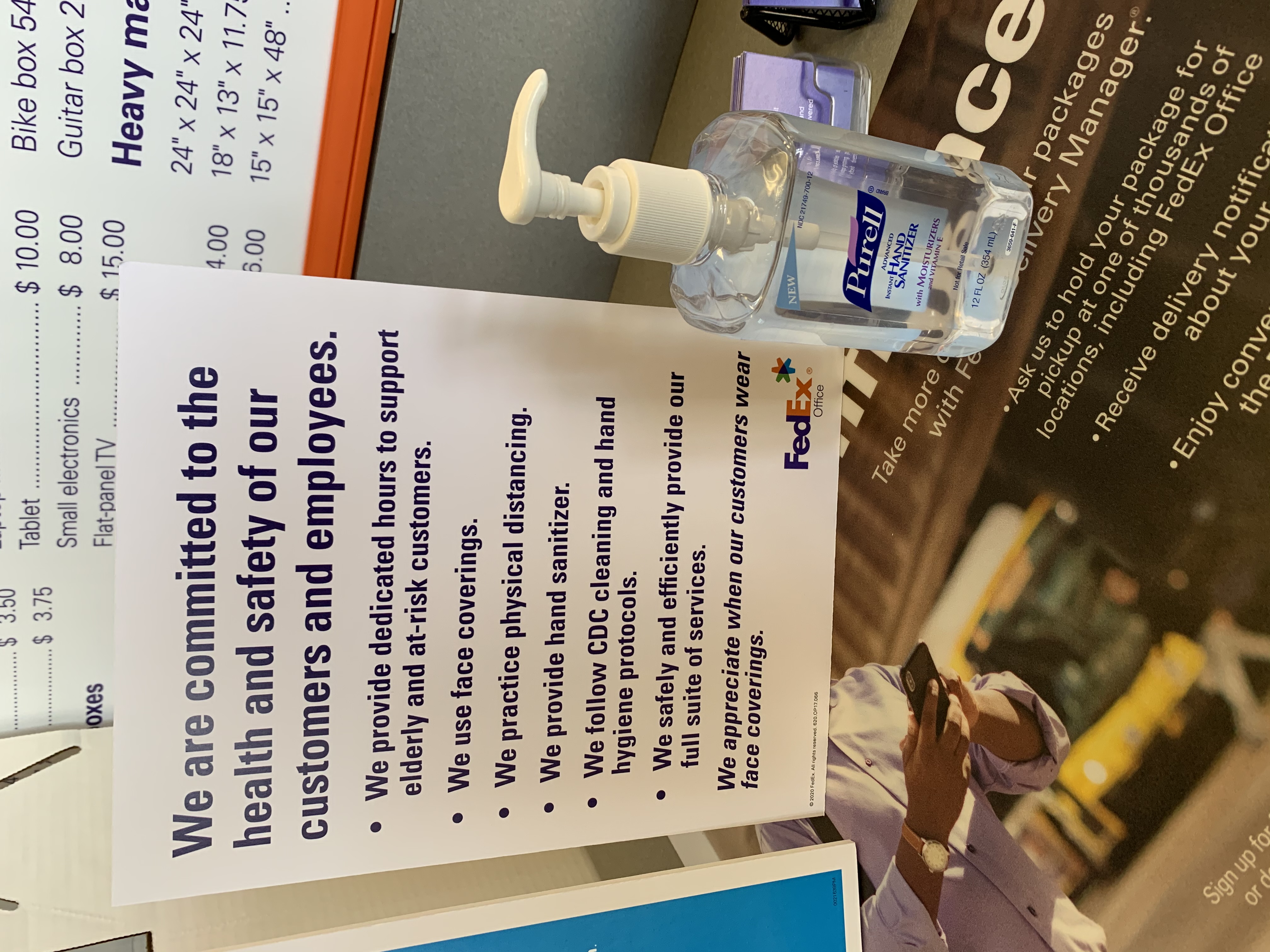 I needed to use FedEx to return some books, and noticed the sign posted on a table at the entrance. A manager rushed to help me as soon as I entered, and told me to feel free to use as much hand sanitizer as I wanted. It seems part of an effort to keep the number of people inside the store to a low number, and get people in and out as quickly as possible.