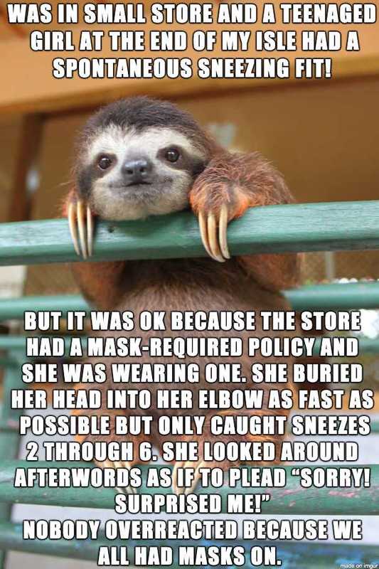 Sloth memes have various meanings depending on the emotion conveyed on the sloth's face. This meme is supposed to showcase a happy sloth, excited that safety guidelines put in place to keep people safe are doing their job. Even if you are coughing and sneezing, you can still do your part to help keep other people safe.