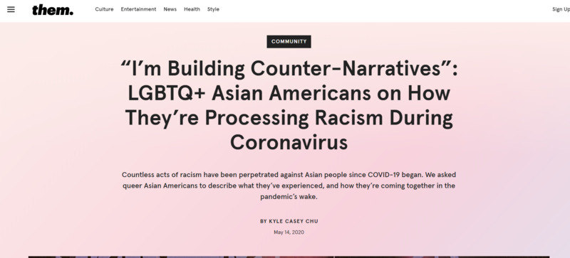 From the article: "Countless acts of racism have been perpetrated against Asian people since COVID-19 began. We asked queer Asian Americans to describe what they’ve experienced, and how they’re coming together in the pandemic’s wake."