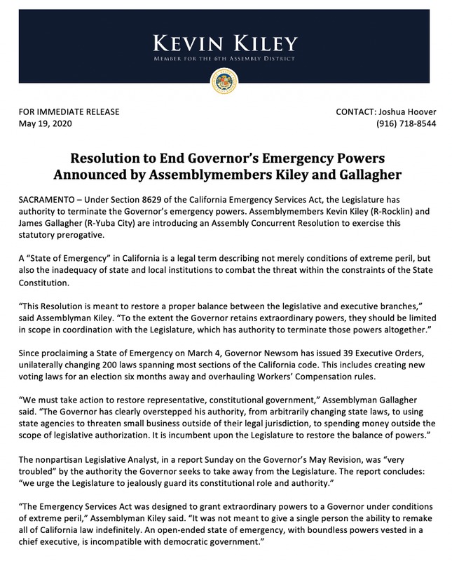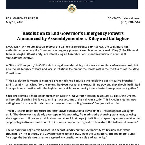 Representative Kiley has introduced legislation to end the State of Emergency in California. In his release, he claims that Governor Newsom has overstepped his constitutional powers, and cites various grievances with the actions that have been taken by the Governor to face the pandemic.