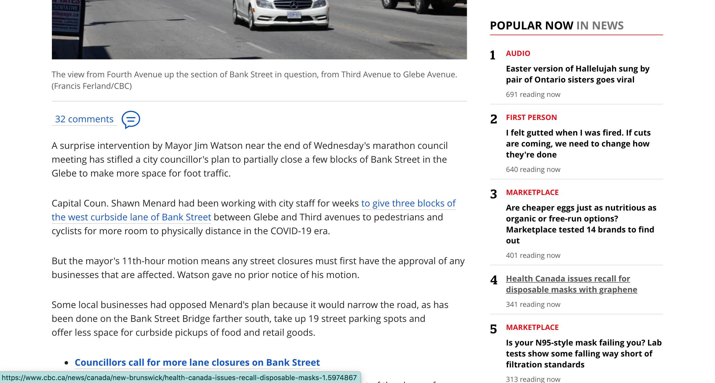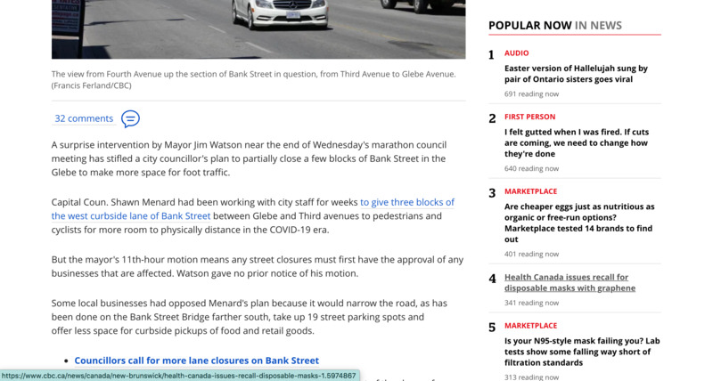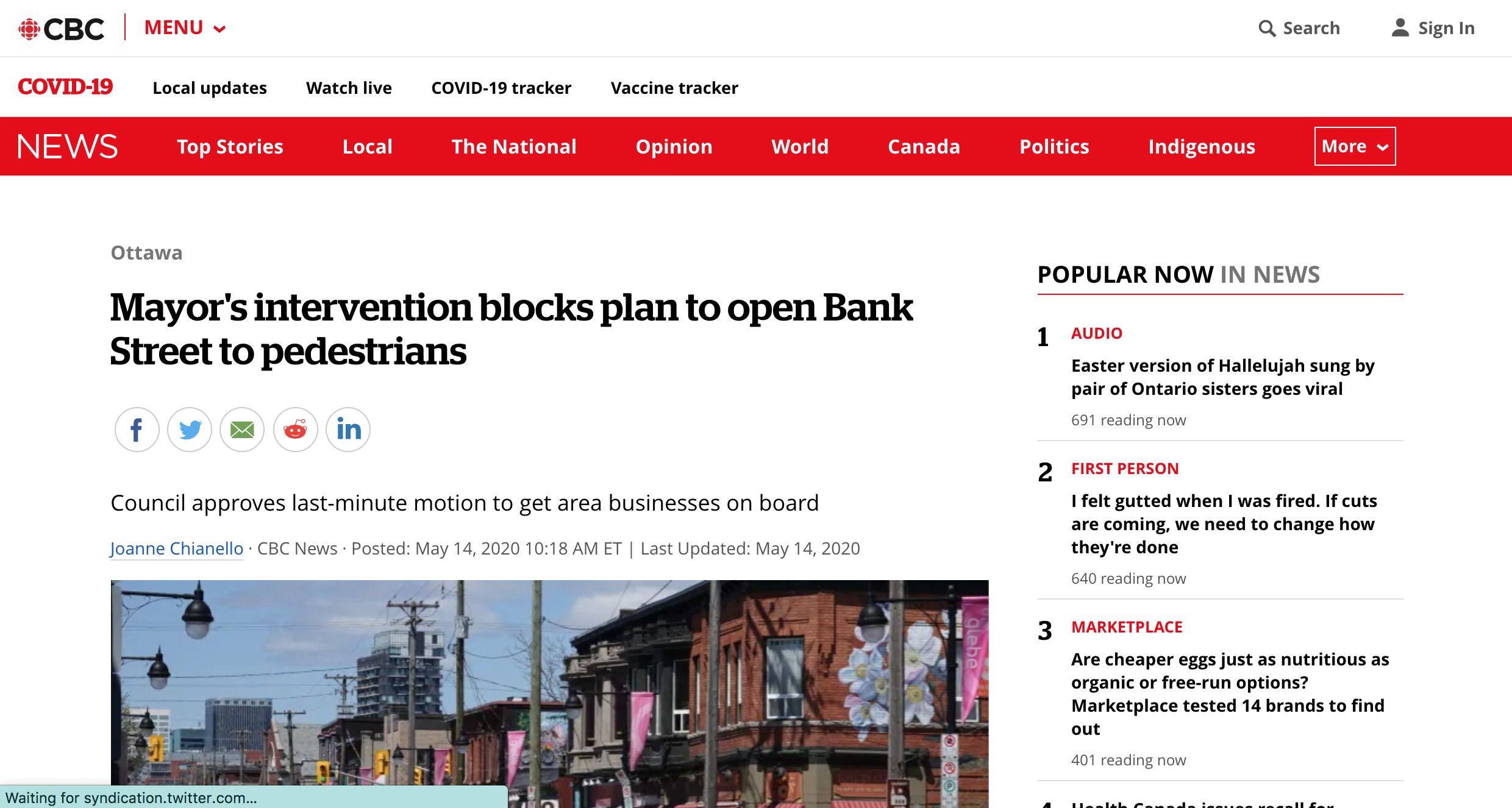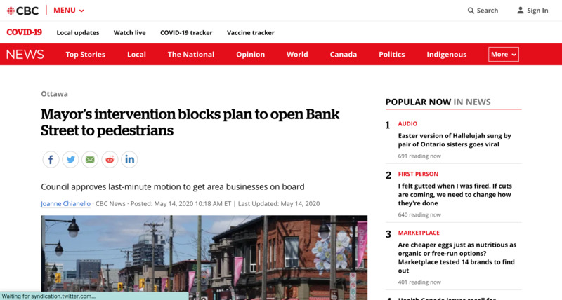 News article relaying that, after initial local support, city council and the mayor vetoed a plan to close some lanes of Bank Street, a major road, to traffic, to allow those walking on the sidewalk, especially when crossing the Bank Street Bridge over the Rideau Canal. would be able to maintain a 2 meter distance from one another. Local businesses were concerned with the reduction in traffic and roadside parking spaces this would cause, further reducing their business in an already difficult time.