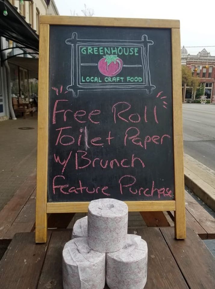 As it became increasingly clear the coronavirus was going to effect the United States people began stockpiling food and other supplies, especially toilet paper. It quickly resulted in no store, online or brick and mortar, had toilet paper in stock. As restaurants tried to quickly shift to pick up and deliver as their only options for remaining open many got inventive with how to attract customers. This restaurant, on the square in Georgetown, Texas, like many others, offered customers a free roll of toilet paper with their take out order.