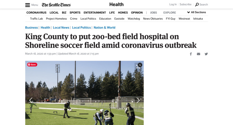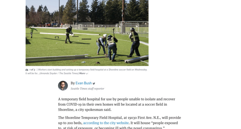 An article from the digital version of the Seattle Times discussing the building of a 200 bed field hospital on a local soccer field.