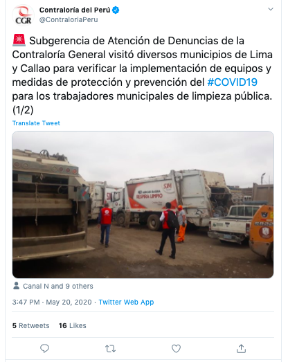 Subgerencia de Atención de Denuncias de la Contraloría General visitó diversos municipios de Lima y Callao para verificar la implementación de equipos y medidas de protección y prevención del #COVID19 para los trabajadores municipales de limpieza pública.