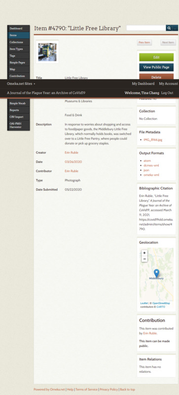 In response to worries about shopping and access to food/paper goods, the Middlebury Little Free Library, which normally holds books, was switched over to a Little Free Pantry, where people could donate or pick up grocery staples.