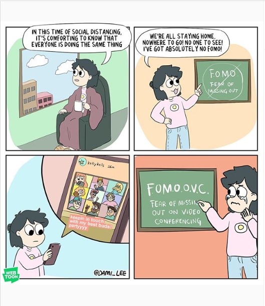 A four panel comic addressing both the distress of isolation while social distancing, the fear that opportunities for socialization are being missing while isolated, and poking fun at the trend of having large, multi-person online video calls. This comic is part of an ongoing autobiographical and comedic series of comics by Dami Lee. As such, the comic also shows how the pandemic has made its way into everyday life and ongoing business and artistic pursuits, creating a wealth of new experiences around which artists may base their work. https://www.instagram.com/p/B-IQb8UAigc/?igshid=14wukruz8k51d *Dami Lee, @dami_lee on instagram*screenshot/ instagram post/ comic*Dami Lee, @dami_lee on instagram