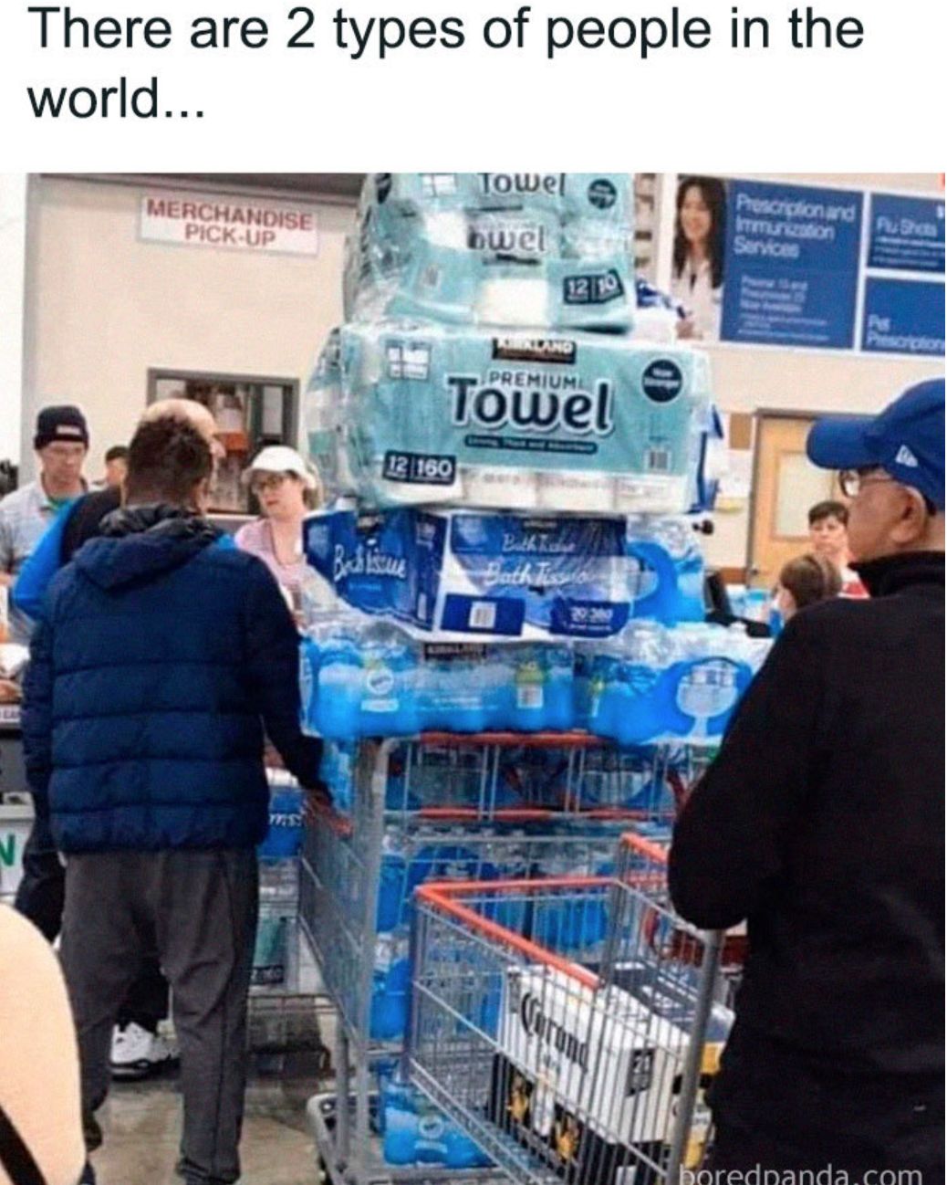 This is a funny meme poking fun at the toilet paper/paper towel hoarding vs the guy who just wants to drink his Corona beer. They are at the checkout line with their goods.