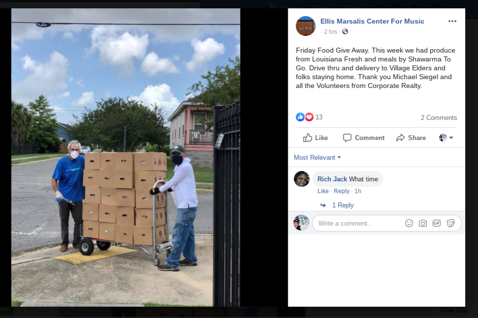 The Ellis Marsalis Center for Music distributes food to Musician's Village residents during the COVID-19 pandemic.