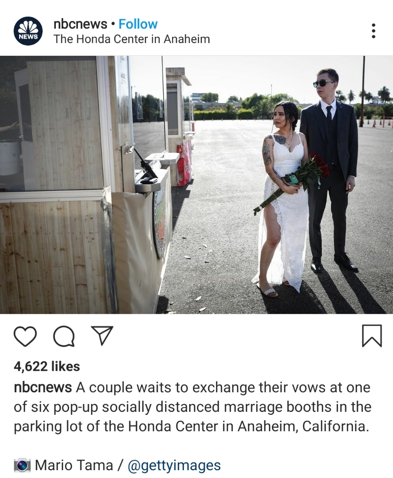 NBC news on Instagram shares a photo of a couple waiting to get married at a socially distanced marriage booth in Anaheim, CA. Many weddings were postponed or cancelled as a result of the virus, but many couples have still gotten married in the face of it all.