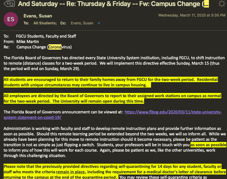 This image shows the day that school was officially suspended at Florida Gulf Coast University