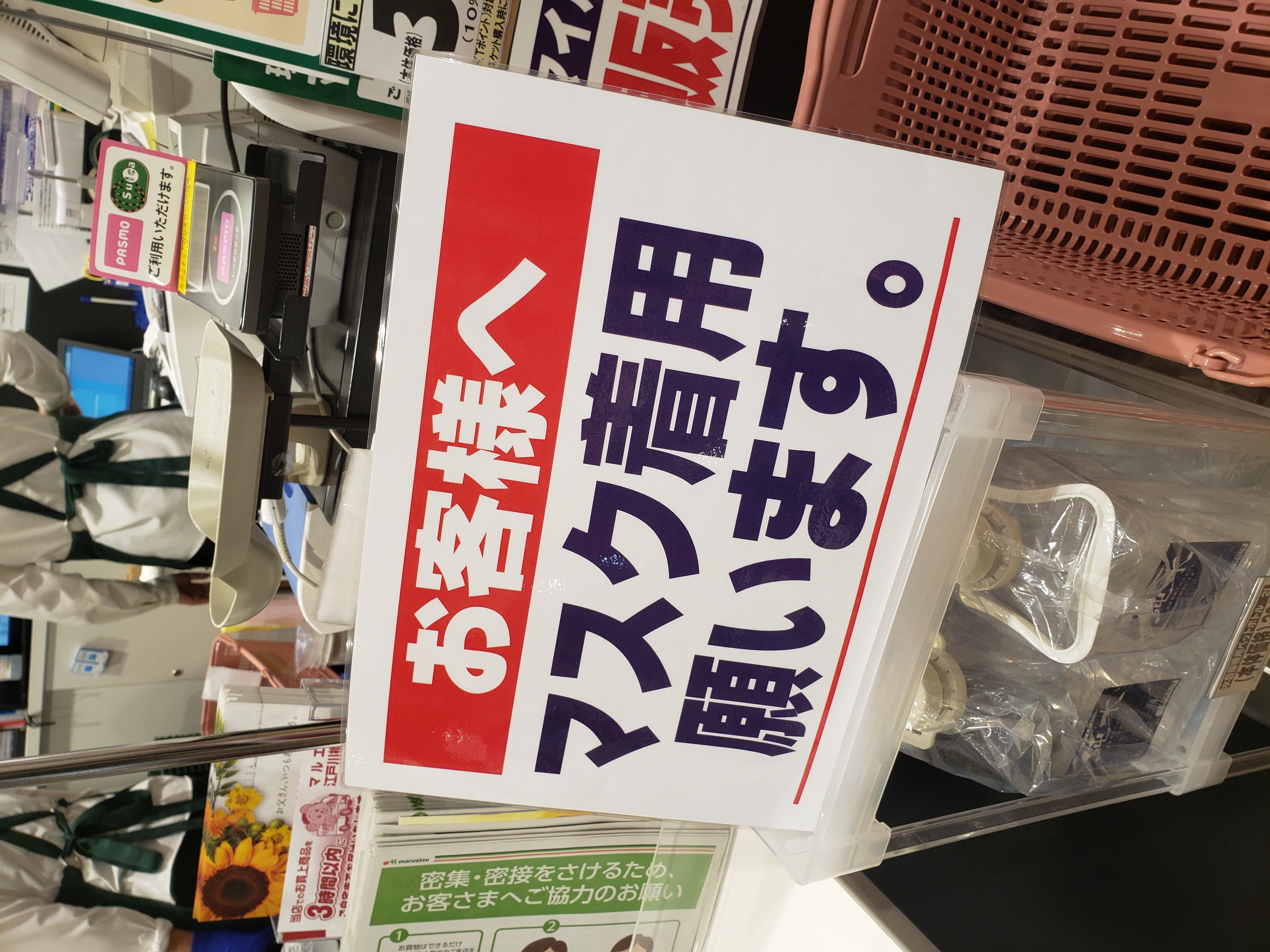 A sign posted near the entrance of a supermarket in the Edogawabashi area of Tokyo, reading roughly "To Customers: We Request You Wear Masks."