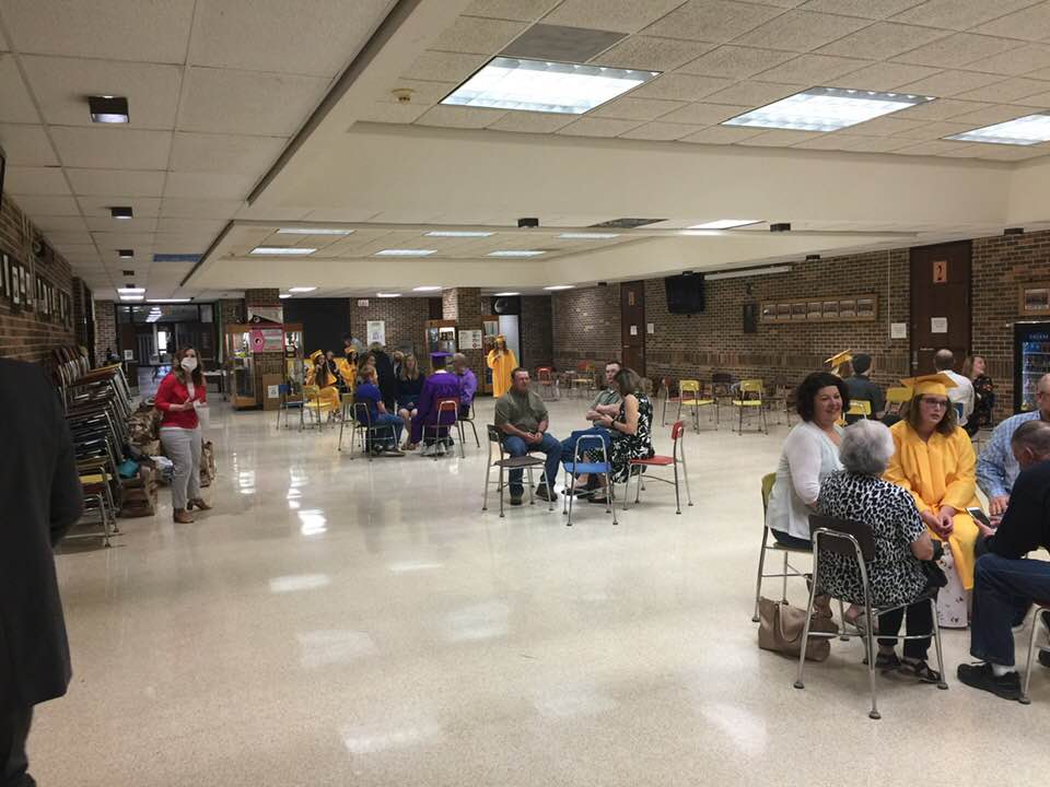 Staging area for the Logan-Magnolia graduation ceremony. Family groups are allowed to sit together in groups smaller than 10, but groups must remain at least 6 feet apart.