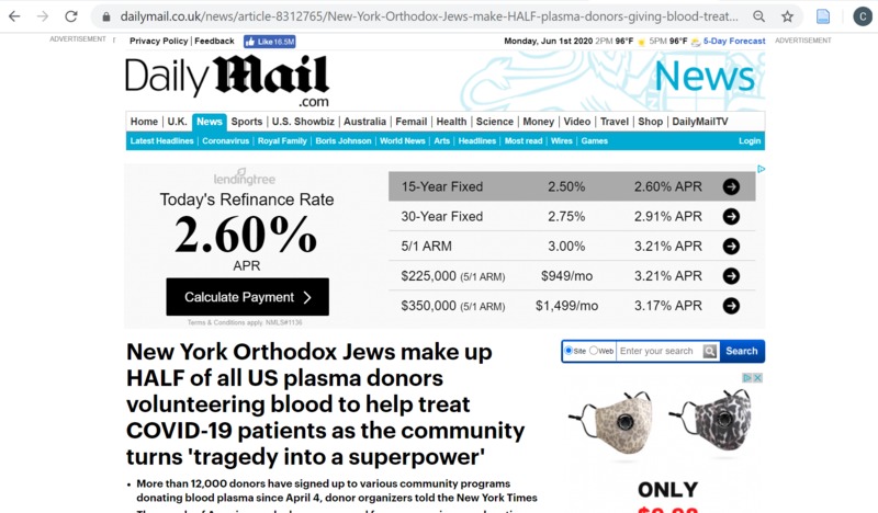 Daily Mail news article about Orthodox Jews being major source of plasma donations during the crisis.