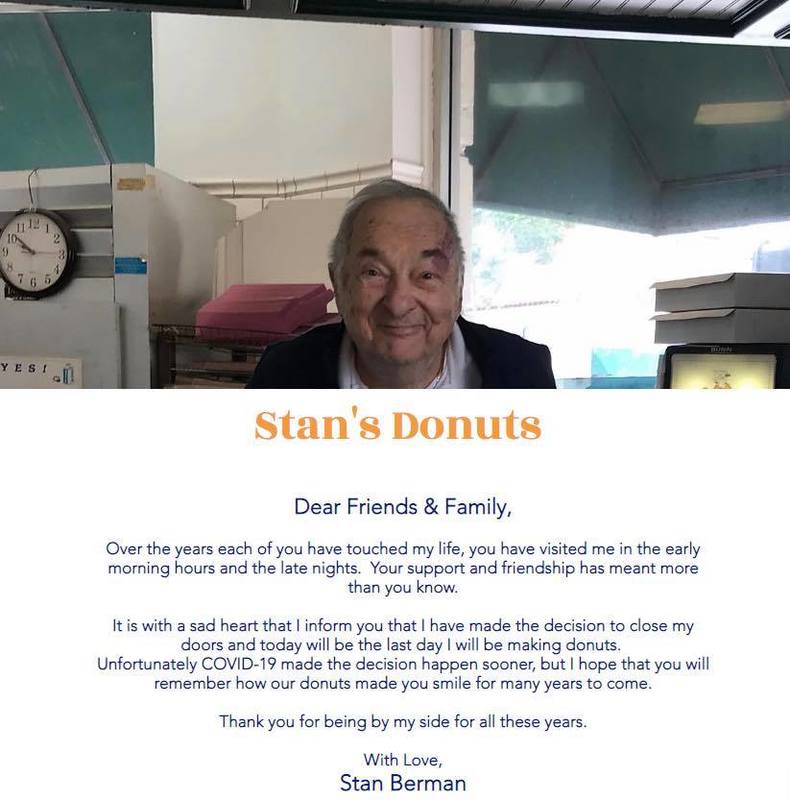 Stan's Donuts in Westwood, Los Angeles was a long-established fixture located just outside of the UCLA campus. It is one of countless small businesses which sadly have not survived this crisis.