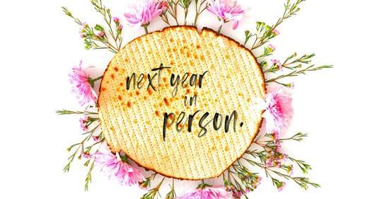 An illustration of a piece of matzah, with the words "next year in person" inscribed on it. The Passover Seder traditionally ends with an expression of hope to celebrate "next year in Jerusalem," a hope related to aspirations for the ancient Jewish homeland, and for peace. This year, separated by stay-at-home practices, we simply hope to celebrate "next year in person."