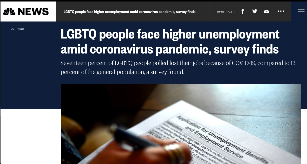 Surveys conducted by the Human Rights Campaign and PSB research demonstrate the vulnerability faced by the LGBTQ community during this crisis. LGBTQ people of color are disproportionately impacted by unemployment amid COVID-19. It's hard to process that these issues are present during an international crisis.