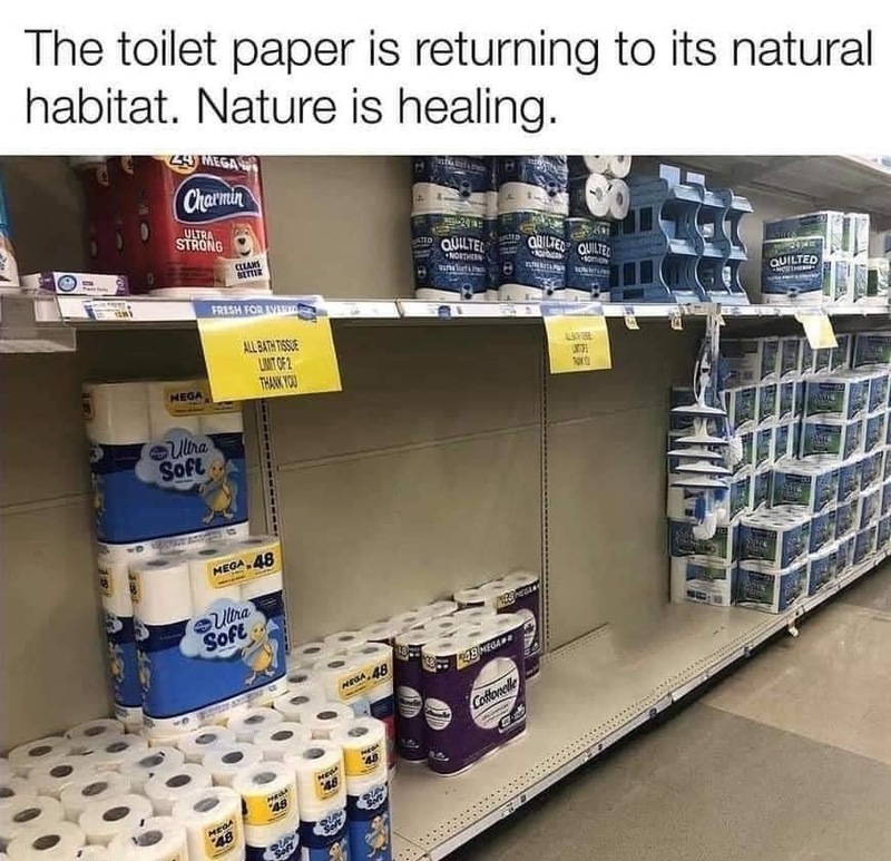 A photograph of bathroom tissue in stock on store shelves. An indicator that the initial panic that consumed the United States is passing, with a humorous twist.