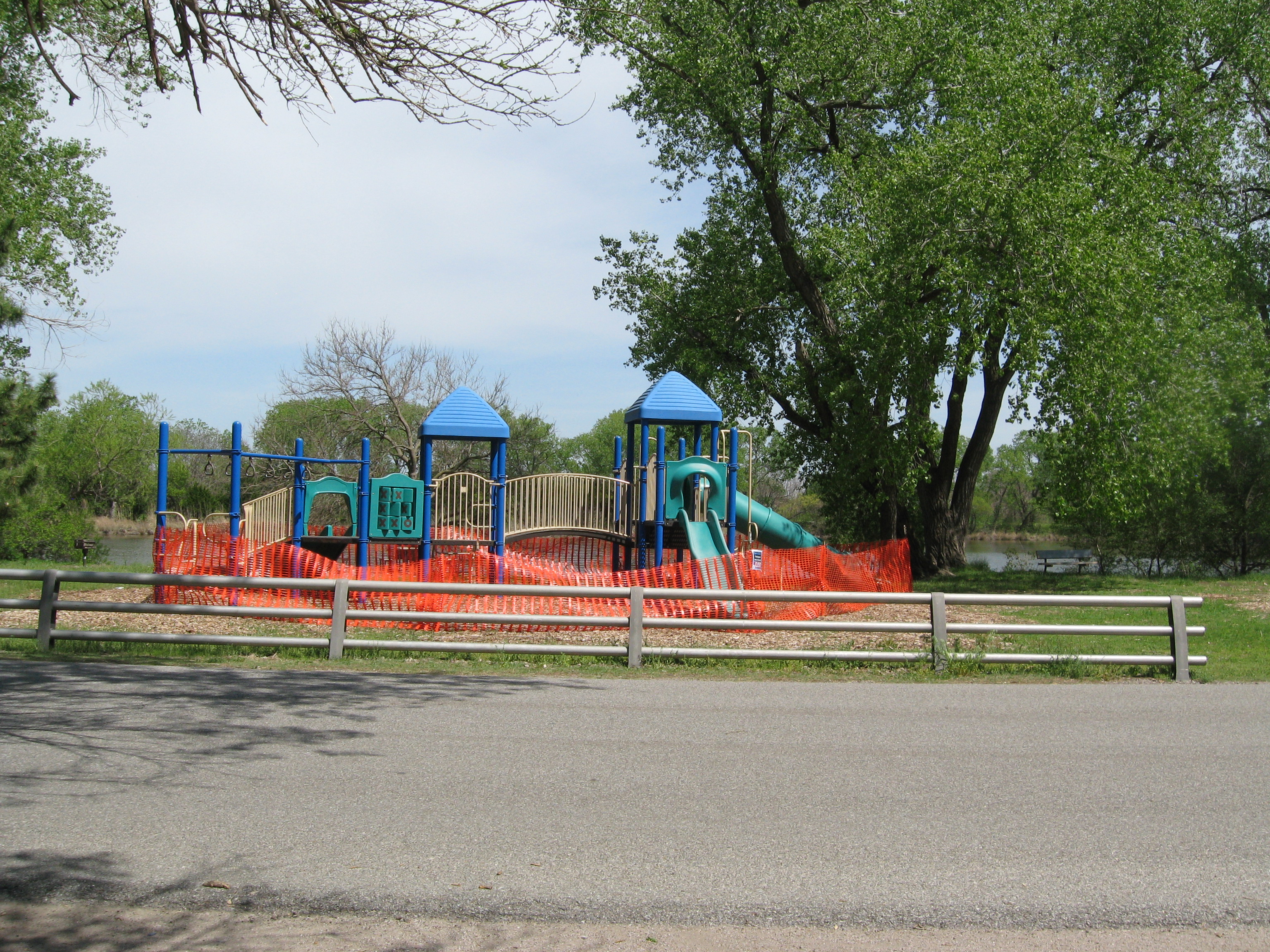 Although Sedgwick County Park remained open to visitors, all playground equipment were off limits, thus reflecting the virus's stealthy transmission via children. Should a child contract the virus, they seldom exhibit symptoms but can easily pass it to adults. Measures such as those depicted in this photo therefore proved to be vital in mitigating COVID-19's spread.