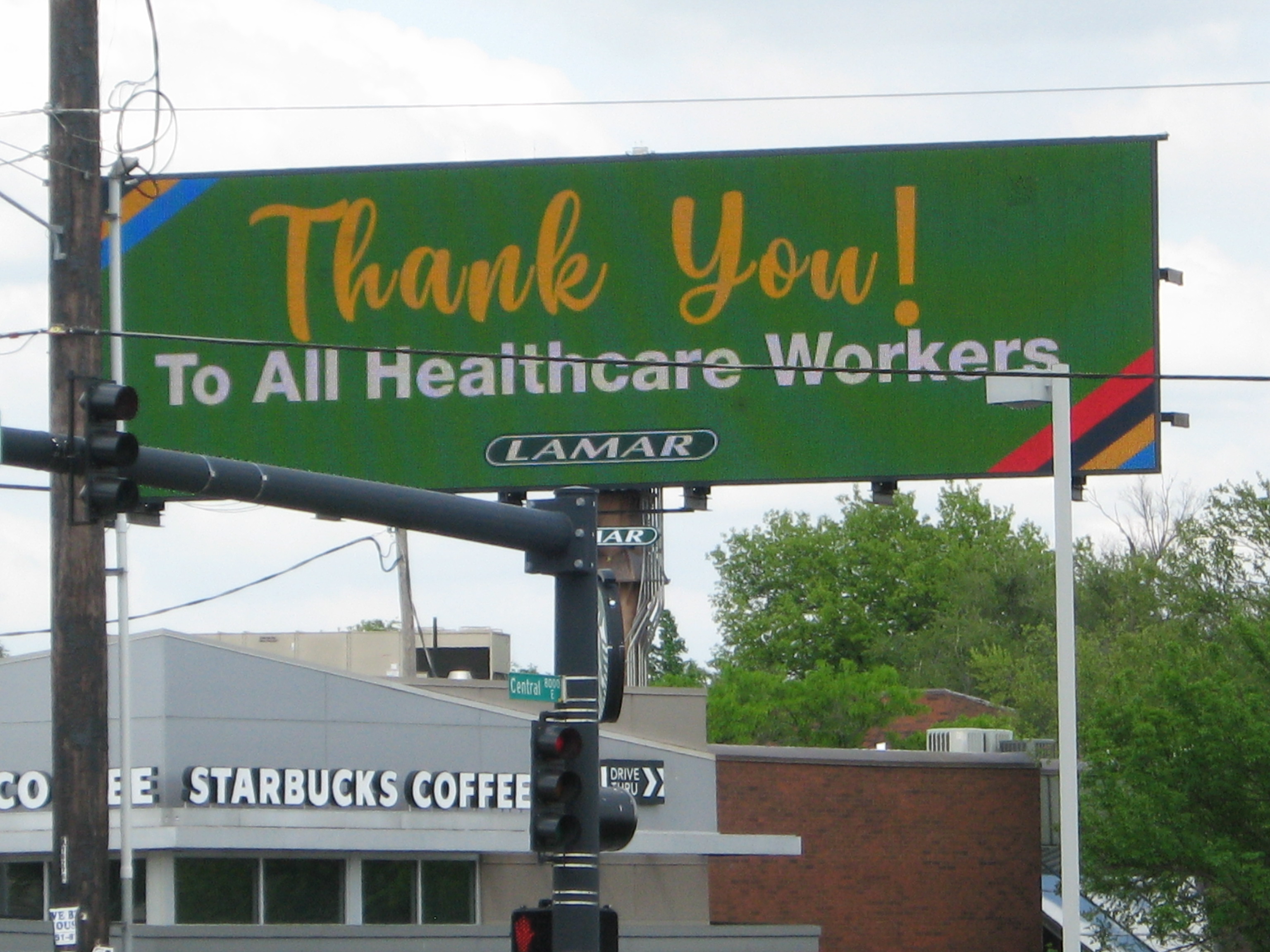 This east Wichita billboard featured many COVID-19 related messages, including this one by Lamar Trailers that expresses gratitude to all healthcare workers battling the pandemic.