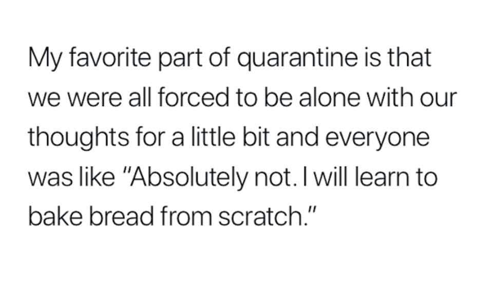 Meme image of black type on white background. "My favorite part of quarantine is that we were all forced to be alone with our thoughts for a little bit and everyone was like 'Absolutely not. I will learn to bake bread from scratch.'"