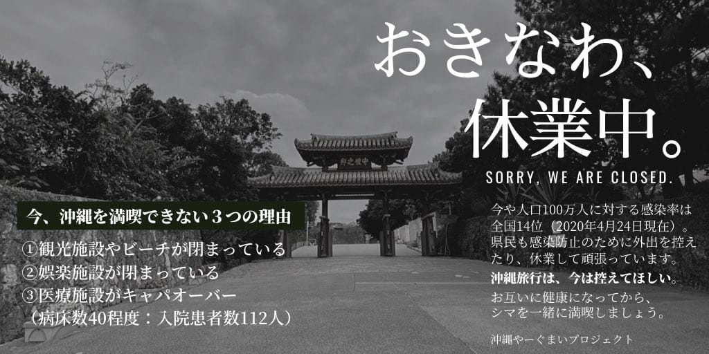 今や人口100万人に対する感染率は全国14位(2020年4月24日現在)。県民も感染防止のために外出を控えたり、休業して頑張っています。沖縄旅行は、今は控えてほしい。お互いに健康になってから、シマを一緒に満喫しましょう。