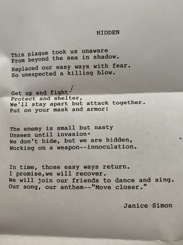 Poem written by my 82 year old grandmother, Janice Simone Simon who says the pandemic is bringing her down because she is old and doesn’t have much time left and doesn’t want to spend the time she does have left in her home.
