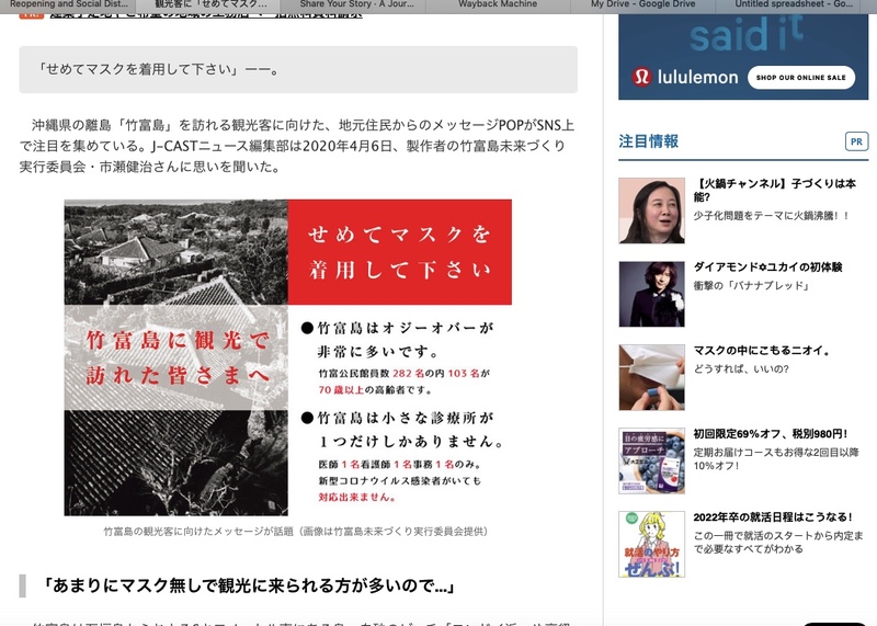 A J-Cast News article on a campaign by Taketomi Island, a small island in southern Japan, to encourage tourists/visitors to at least wear facemasks if they're going to visit the island. This article highlights the difficult position so many places and businesses are in - they need tourists for their economic well-being, but they also need to block the spread of the virus. A dilemma. While many islands are discouraging tourism altogether, Taketomi has apparently decided it's too vital for the economy of the tiny community.