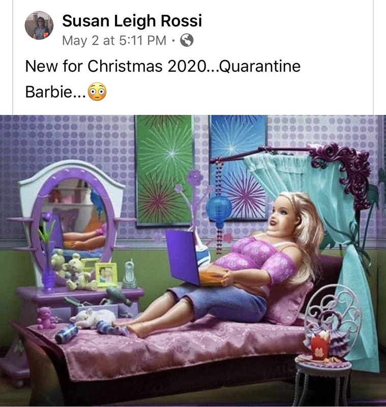 The image shows an obese Barbie lying on a bed with a laptop, a cat, and two cans of soda. Next to her is a chair with a purse and a large french fry. The image is captioned "New for Christmas 2020...Quarantine Barbie...(surprised faced emoji)." The meme is a comment on the issue of gaining weight during the quarantine.