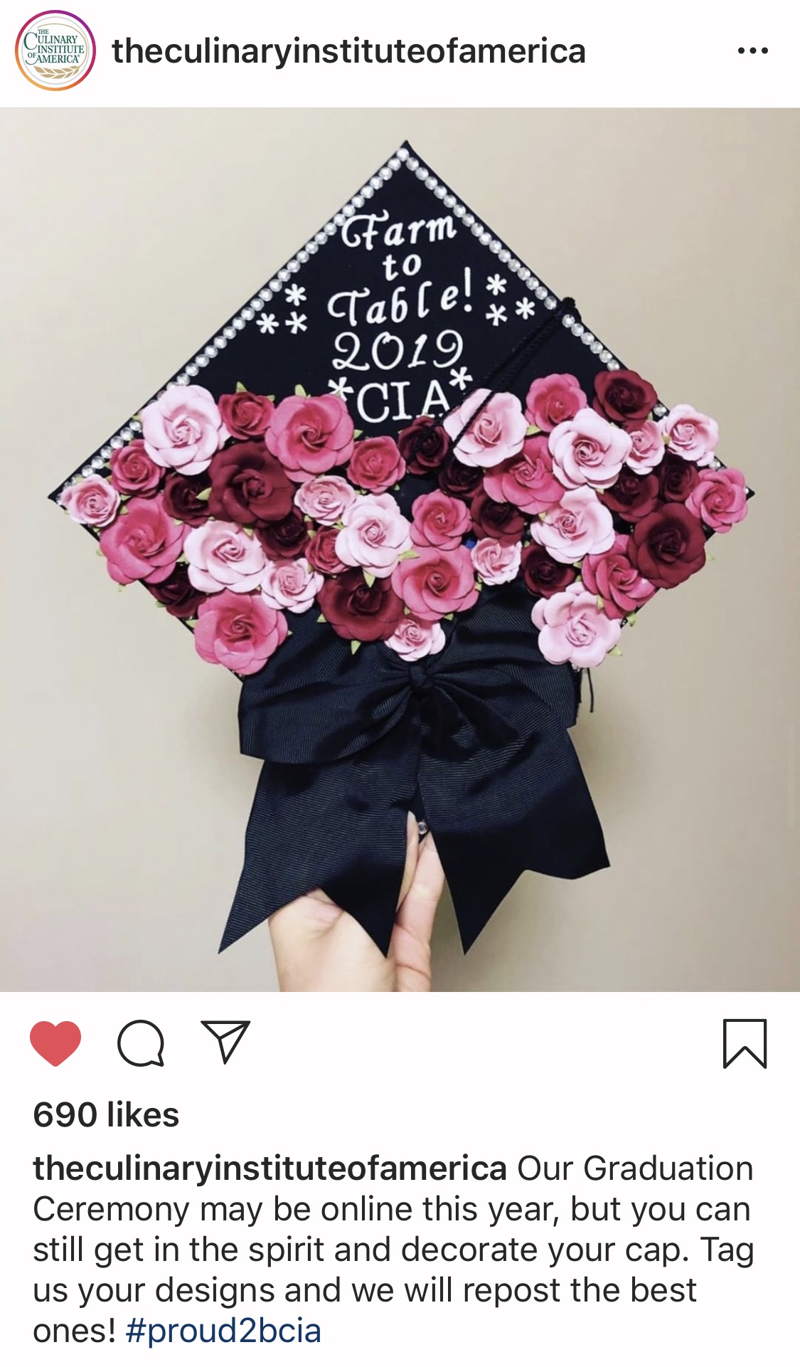 Image is of an Instagram post by the Culinary Institute of America to their graduates. The picture shows a graduation cap decorated with a black bow, a rhinestone border, and a gum paste roses of various shades of red and pink with gum paste leaves. The cap has the words "Farm to Table! 2019 *CIA*" in white letters. The post states, "Our Graduation Ceremony may be online this year, but you can still get in the spirit and decorate your cap. Tag your designs and we will repost the best ones! #proud2bcia." The Culinary Institue of America has been shut down since March and taken as many of their classes as possible online. No information is provided about the date of the graduation or which degree is being awarded. The CIA has graduations typically every three weeks for Associate degree students and multiple graduations per year for Bachelor's degree students.