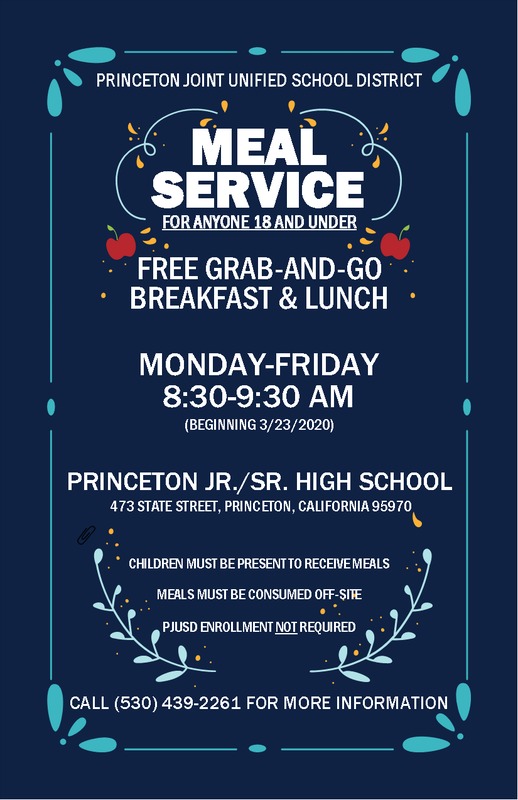 Poster released by Princeton Joint Unified School District informing the local community about the free grab-and-go breakfast and lunch options for anyone 18 and under during campus closures. Following state guidance, school districts in the area served any child requesting food, regardless of enrollment status. #ASU #HST580