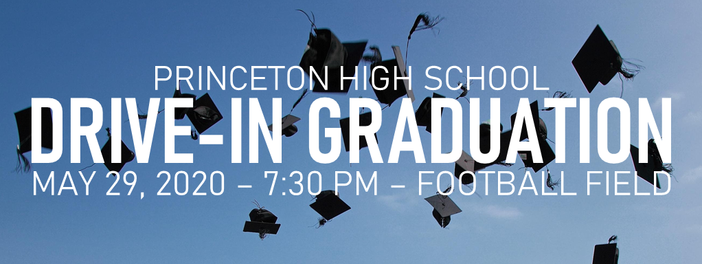 Informational graphic announcing the style, date, time, and location of the Princeton High School graduation ceremony. Following the guidance issued by the County of Colusa Department of Health and Human Services, the Princeton Joint Unified School District Board voted to hold a drive-in graduation where families and friends would view the ceremony from parked cars. #ASU