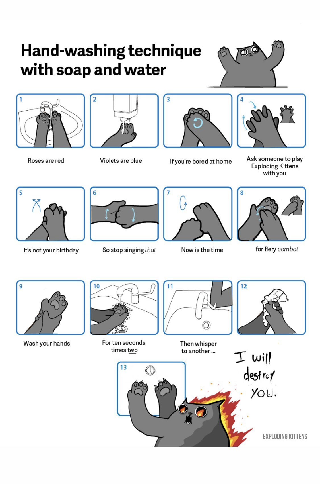 Exploding cats take on washing your hands to prevent the spread of coronavirus. It is a humorous take on having to wash your hands over and over.