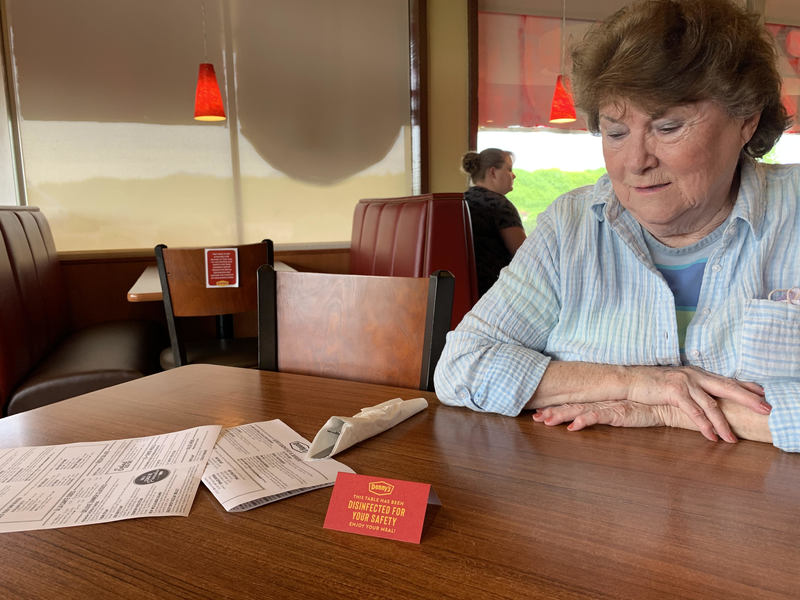 Taking my grandmother Janice Simon to lunch at Denny's as shelter-in-place orders are lifted. The staff is wearing masks and every-other table is closed. All utensils and plates are disposable. Everyone there was so excited to be there.