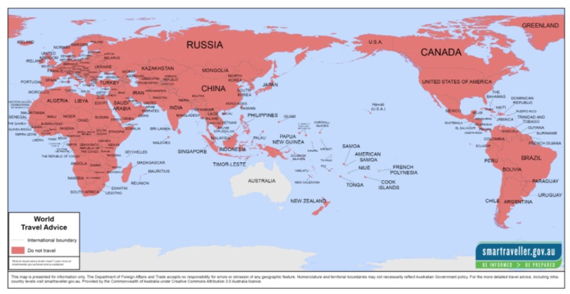 SmartTraveller is the Australian Government's travel advisory website. This may be a historical first: every continent on the SmartTraveller map is red. The government's official advice is 'Do Not Travel' for everywhere in the world. It's a striking visual that sums up the universality of the pandemic experience.