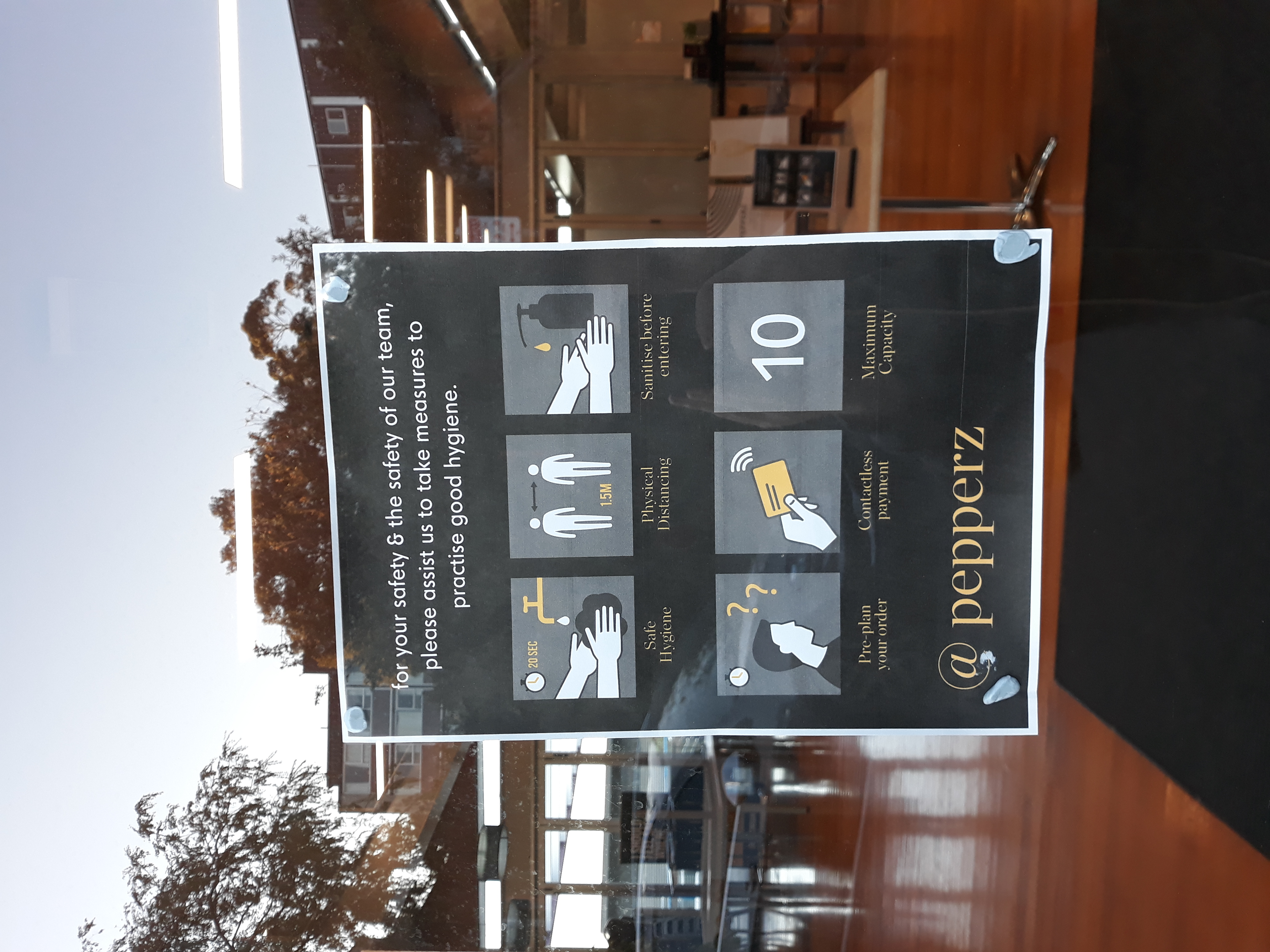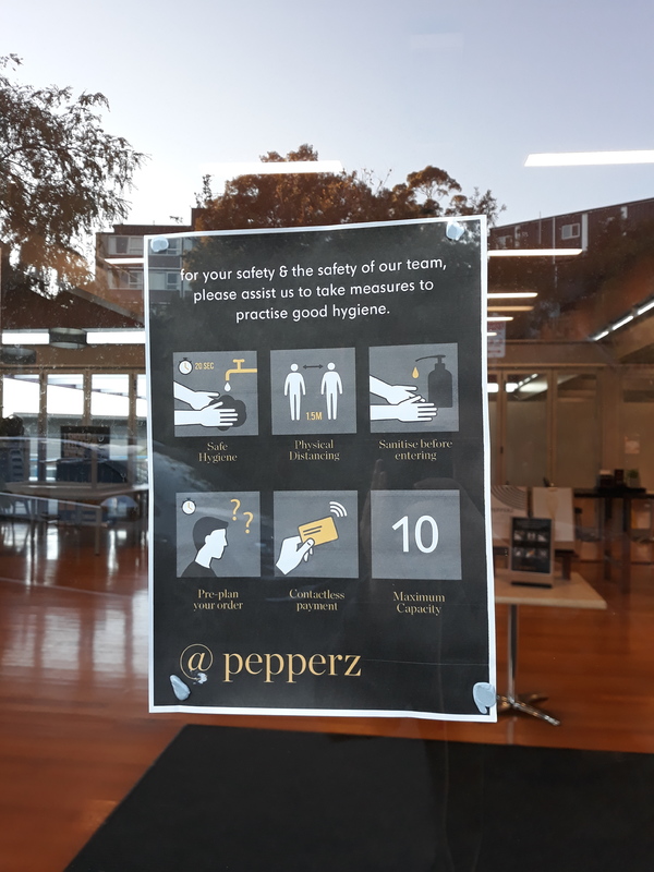 A safety poster on the window of Pepperz, the restaurant of the UTAS College Road student accommodation. Pepperz became a vital source of cheap cooked meals for many residents who relied on communal kitchens prior to the lock down. Access to those kitchens was restricted due to social distancing measures.