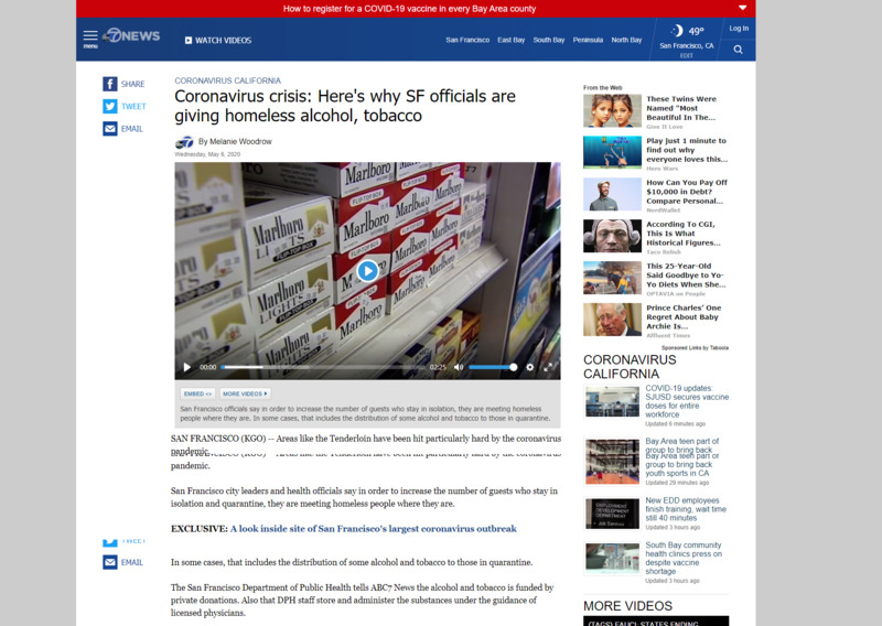 This news story highlights the reasons for San Francisco's homeless substance distribution policy during the COVID-19 pandemic. https://perma.cc/YK5B-SWBP