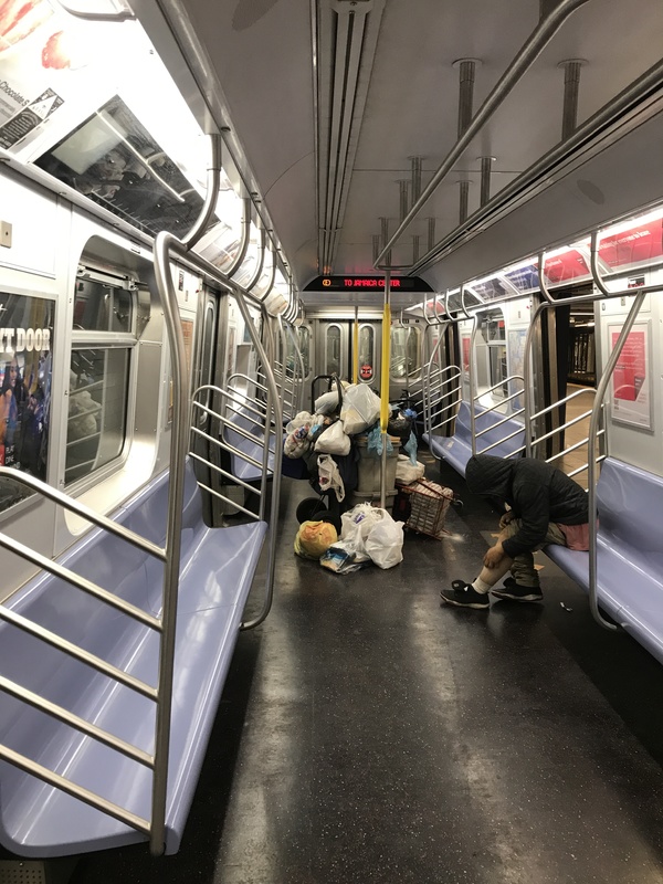 Homeless person brings his personal belongings on empty subway car in New York City .