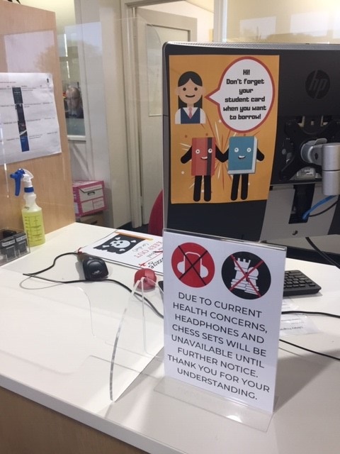 Mentone Girls' Grammar School Kerferd Library information desk during the COVID-19 return to campus (Phase 1) 26 May 2020. For student and staff safety the library stopped lending headphones and chess sets. In phase 1 junior school students in Prep to year 2, as well as senior school students in years 10, 11 and 12, returned to campus. Students in years 3 to 9 remained off campus and continued with online learning until phase 2 which commenced on 9 June 2020.